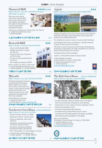 Complimentary WiFi available. Anjeric is the perfect base to enjoy Scilly. Judy and Barry Archer Lower Strand, St. Mary’s TR21 0PS E. judyarcher@yahoo.co.uk T. 01720 422700 www.visitislesofscilly.com