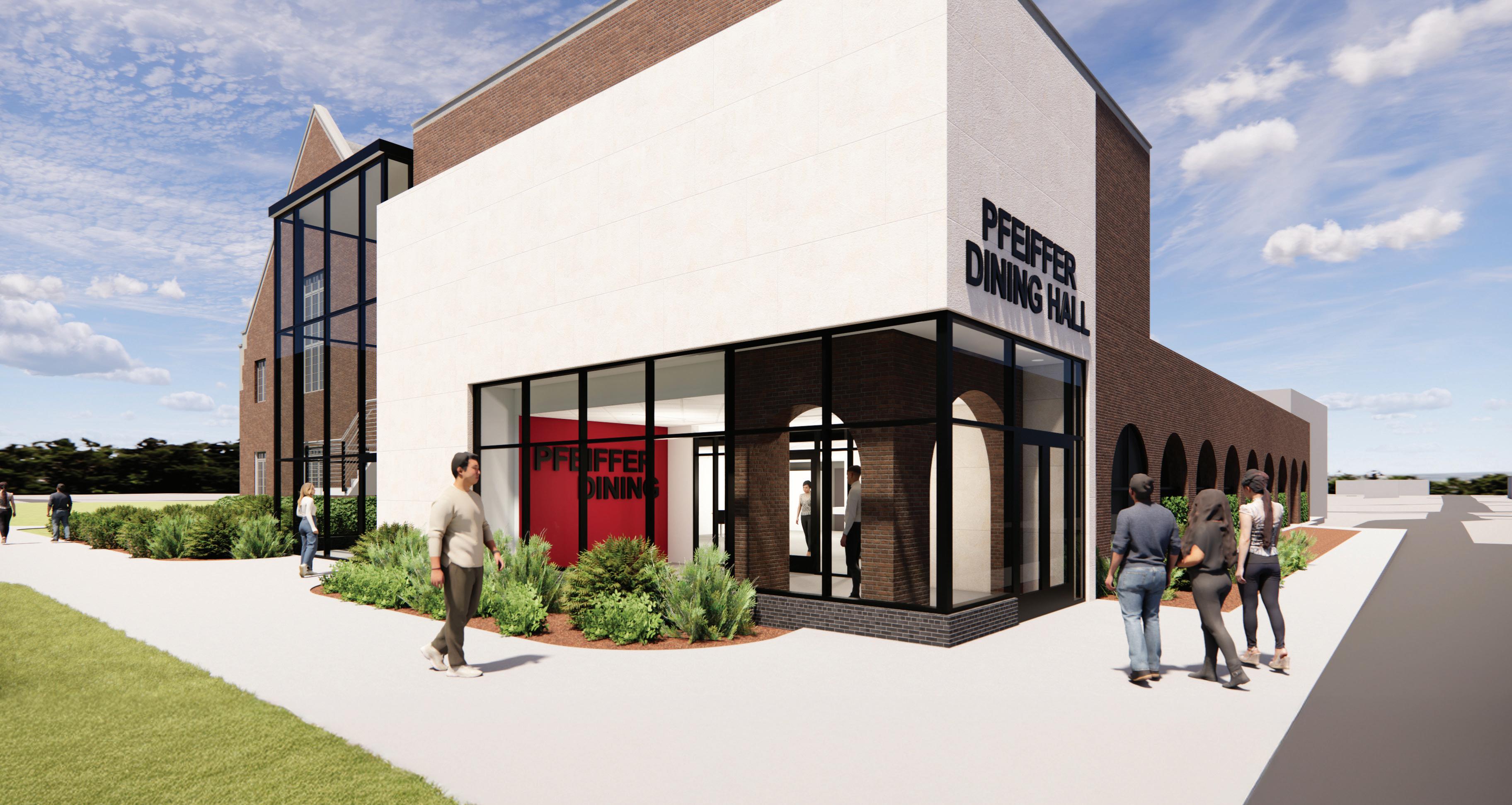 The project calls for a complete transformation of the Pfeiffer and Great Hall building’s interior. The renovated dining hall will feature a new entrance and flow through the reimagined space, as well as fresh furnishings, flooring and décor. New lighting and windows will brighten the dining experience, while redesigned serving stations will offer a rich variety of expanded menu options. Finally, a new north side dining patio will offer rewarding views of campus and Buxton Park.
