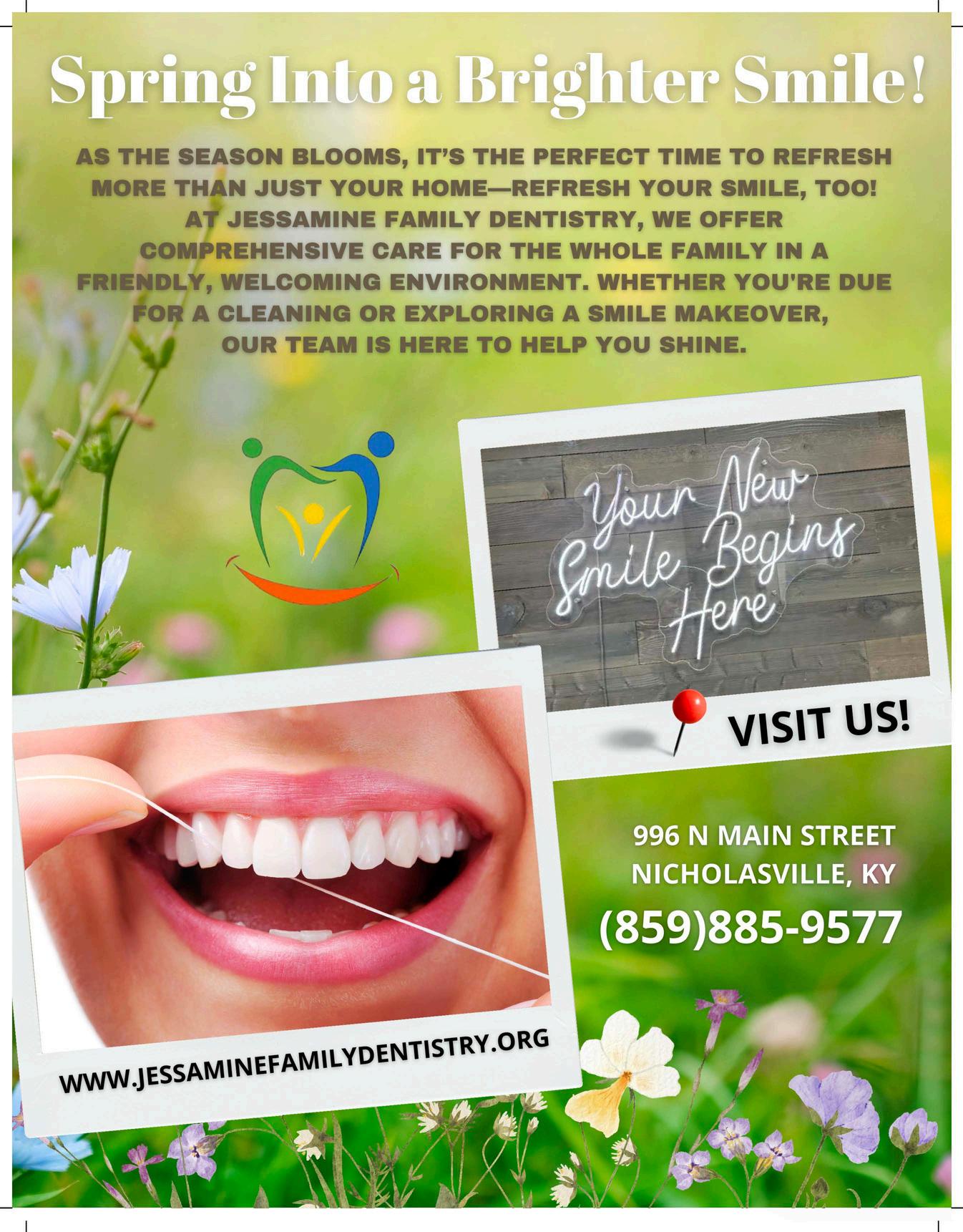 So, as usual, I’m going to challenge you to step out of the every day grind and try to enjoy this season Us Southerners like front porch sitting, sweet tea drinking, and lazy evenings watching the lightening bugs Make the sun tea you ’ ve been missing Try your hand at peach cobbler but it doesn’t count if you don’t put ice cream with it Start a project like painting your porch or building a flower, herb, or vegetable garden If you aren’t attached to the squeak under the floorboard on the back porch, you might finally get around to fixing that too Camp Nelson has wide open fields for you to walk in the quiet with the flowing grass To me, it’s one of our very best kept secrets in Jessamine County It’s so beautiful, vast, and relaxing If you want something more challenging try hiking or canoeing Or relax and take up painting Start with flowers because: spring I hope when you ’ re flipping through the pages of this edition of Jessamine County Living, you remember that each of them were made for you. Thank you for being here. Thank you so much for picking this up and giving it a read. Thank you for loving on the advertisers.