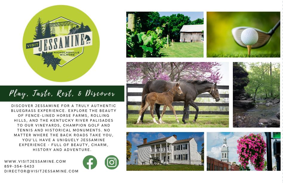 Temperatures are rising, days are getting longer, and the indications of spring have fallen upon Jessamine County Many associate springtime as a representation of regeneration and growth, which I feel is an appropriate interpretation for our county Jessamine County continues to grow and change, moving forward to encompass the needs of residents and visitors, while also maintaining tradition and history I hope everyone gets the opportunity to take a moment to enjoy the charisma of our county by visiting the local shops, experiencing the beautiful nature, and making memories at the unique attractions Jessamine County holds