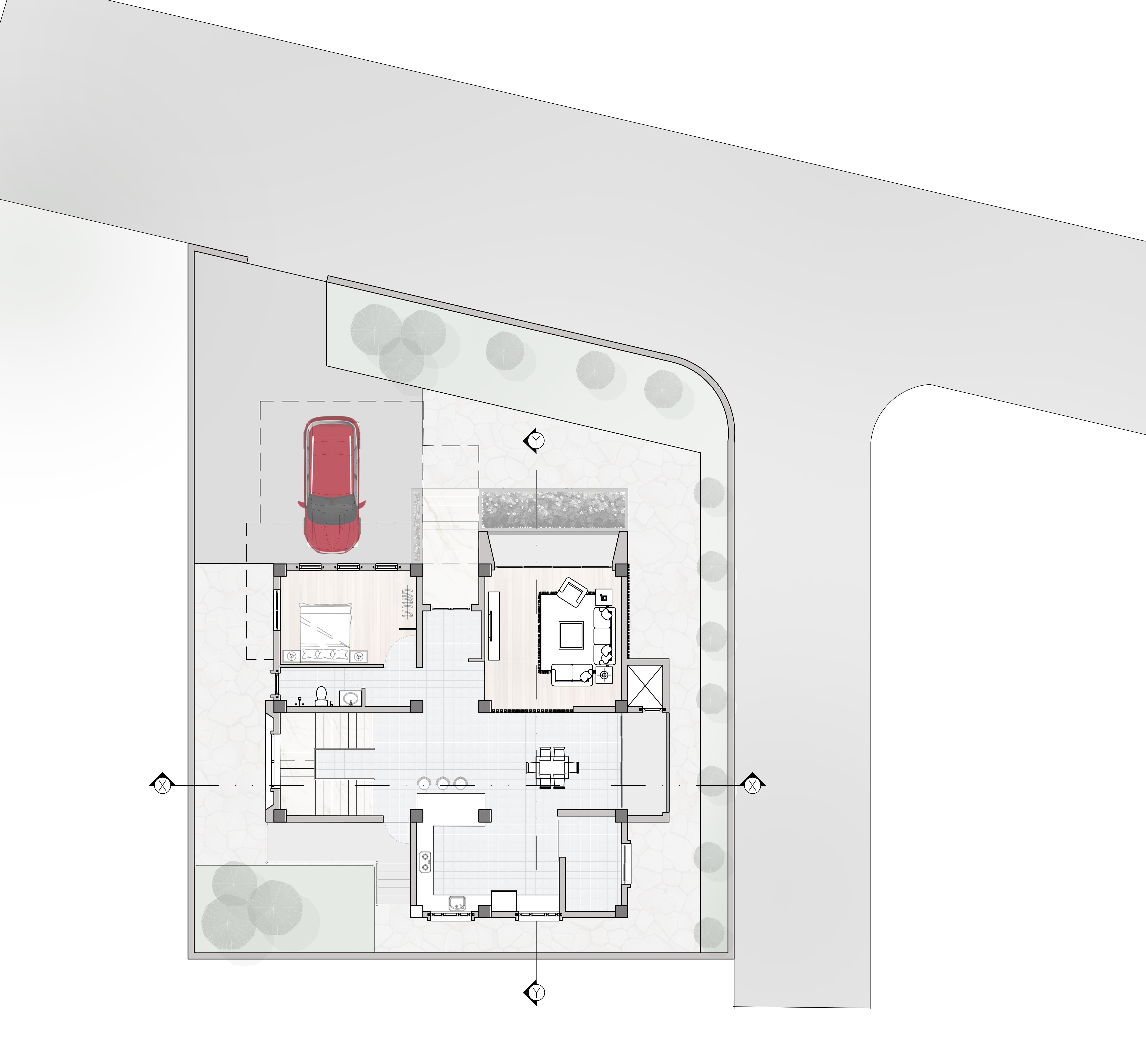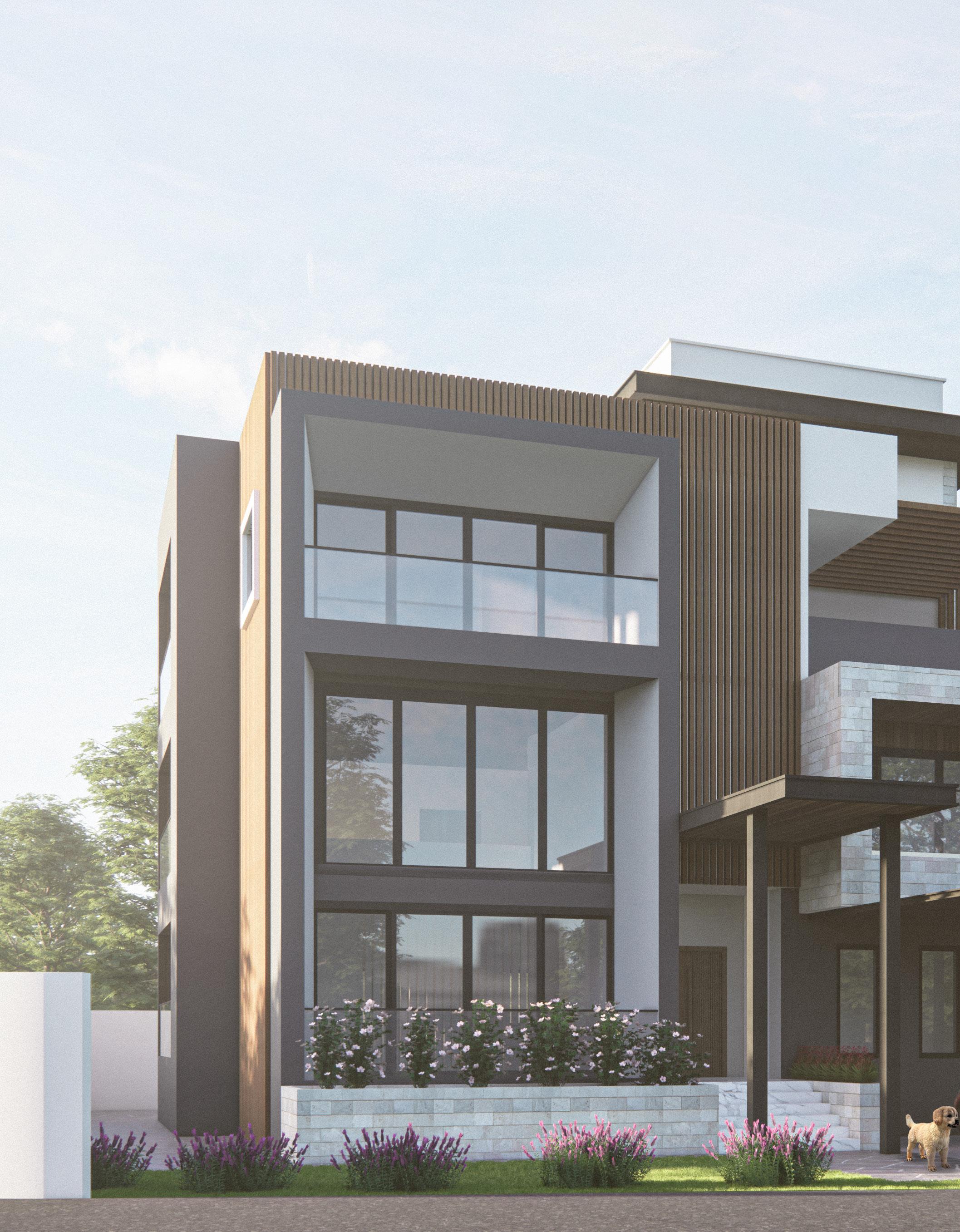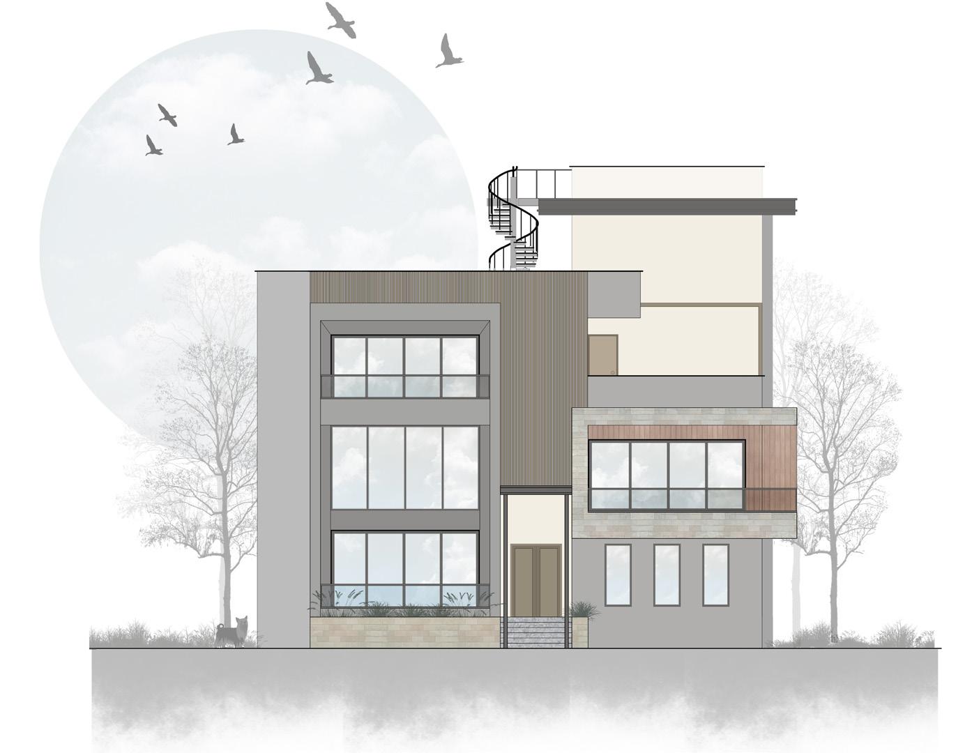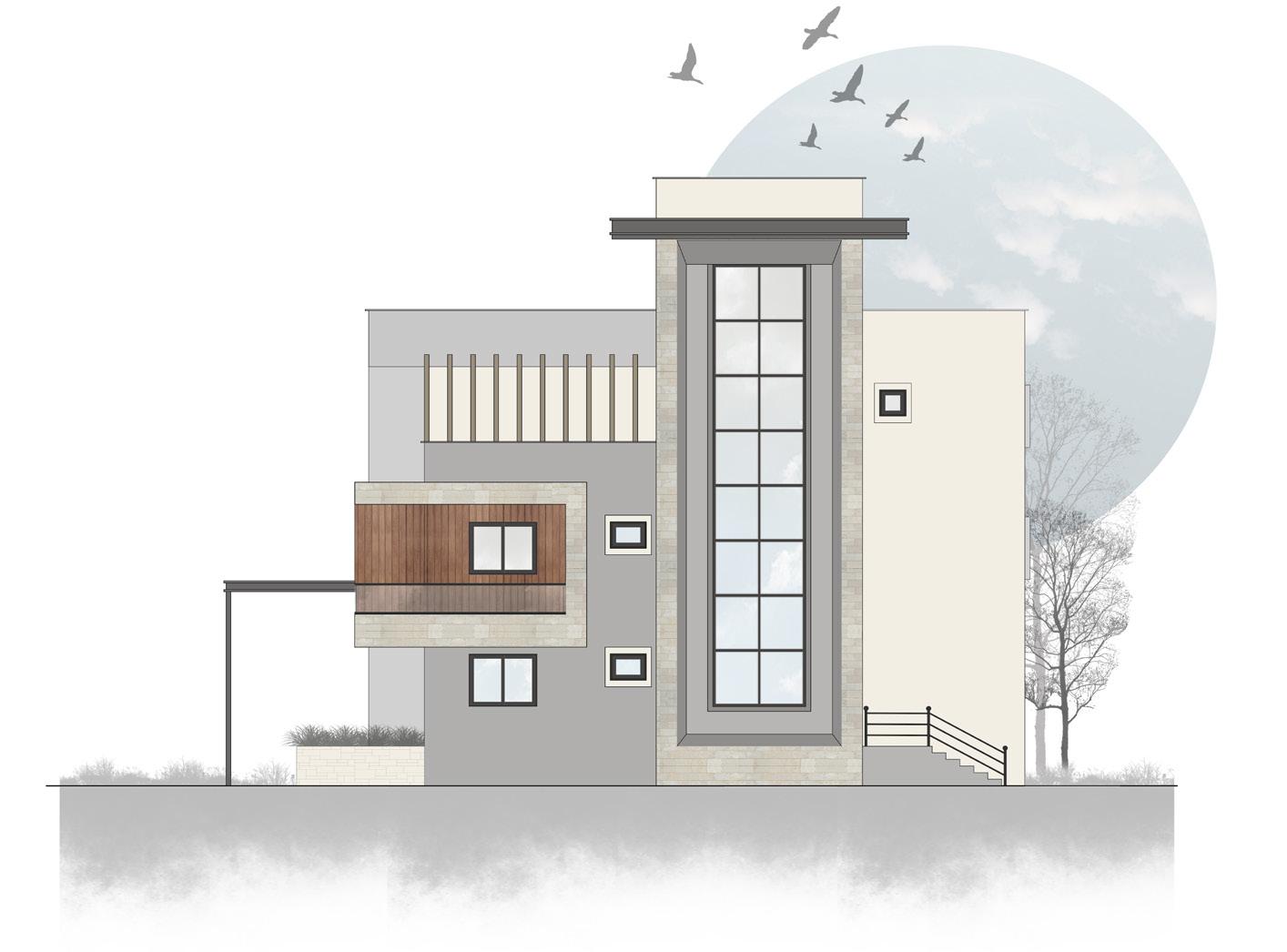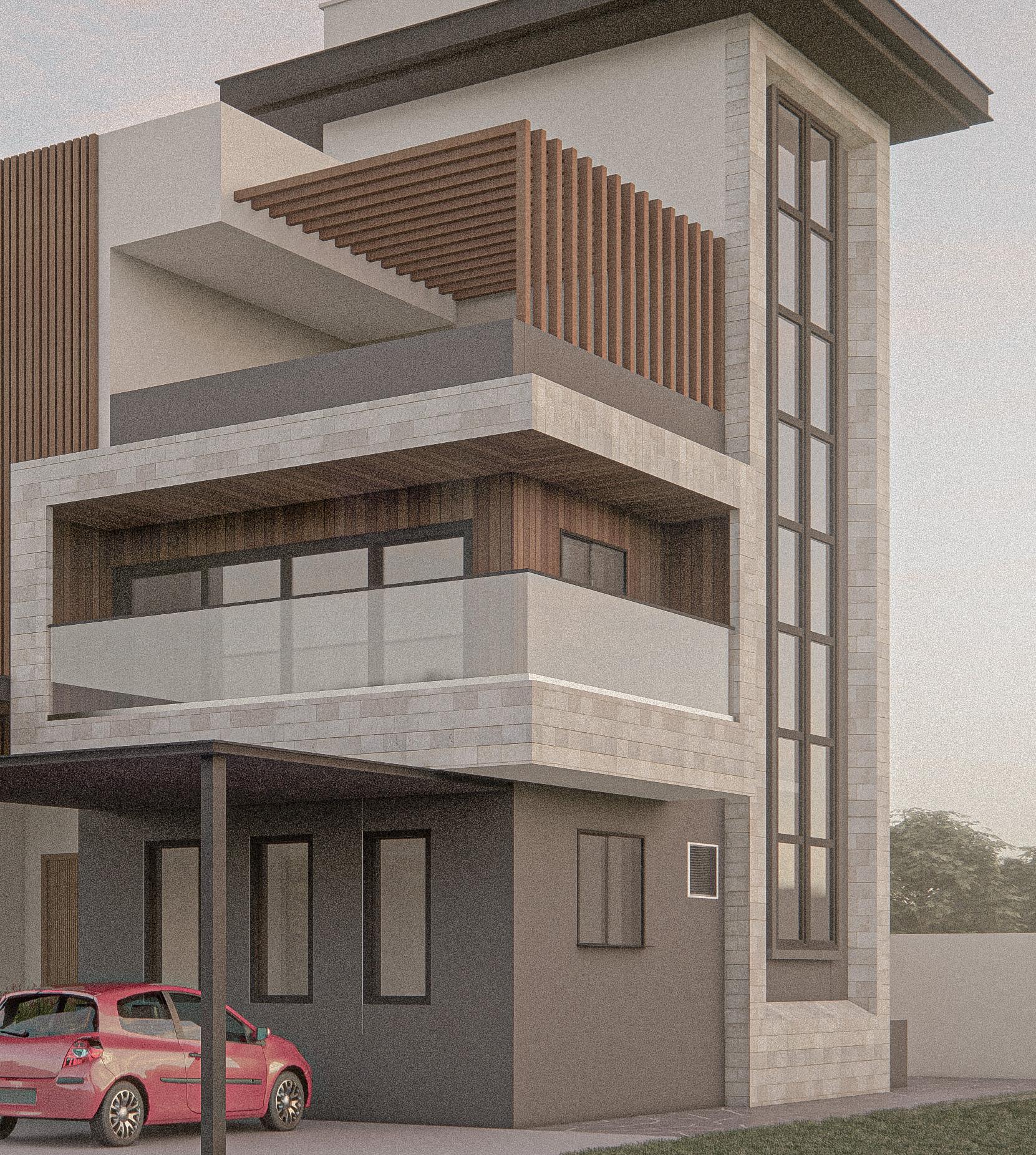 This design mixes modern style with natural elements for a stylish yet cozy home. Sharp lines and bold shapes give it a contemporary look, while wood, stone, and glass add warmth. Large windows and balconies bring in light and fresh air, connecting indoors and outdoors. The result is a beautiful, modern home that feels natural and inviting.
