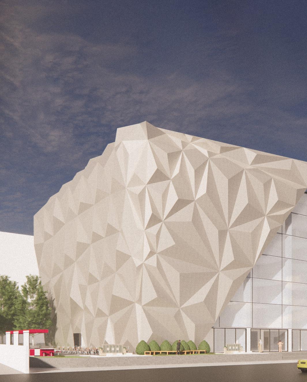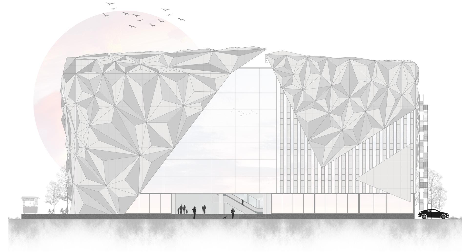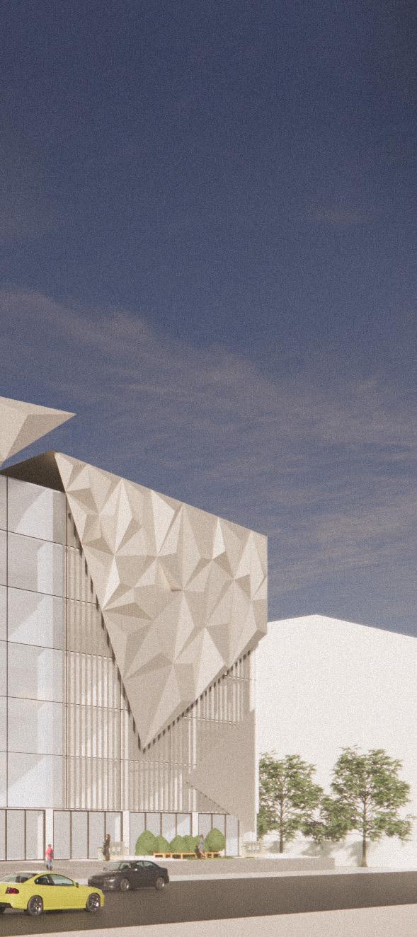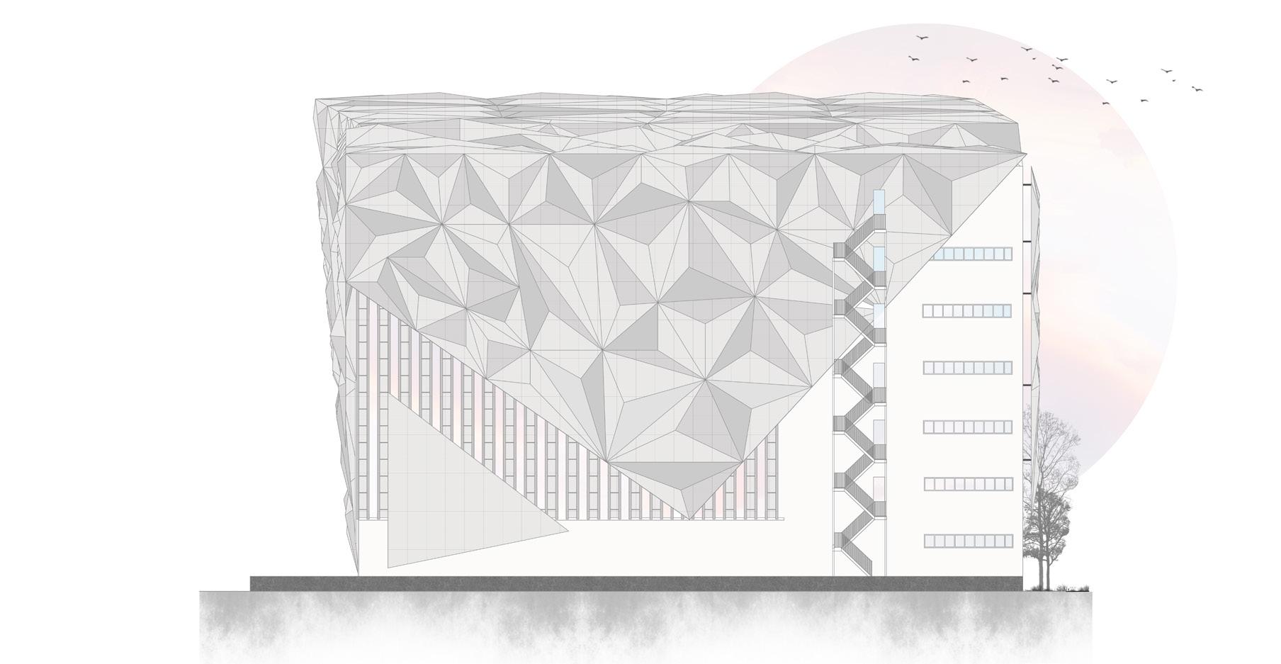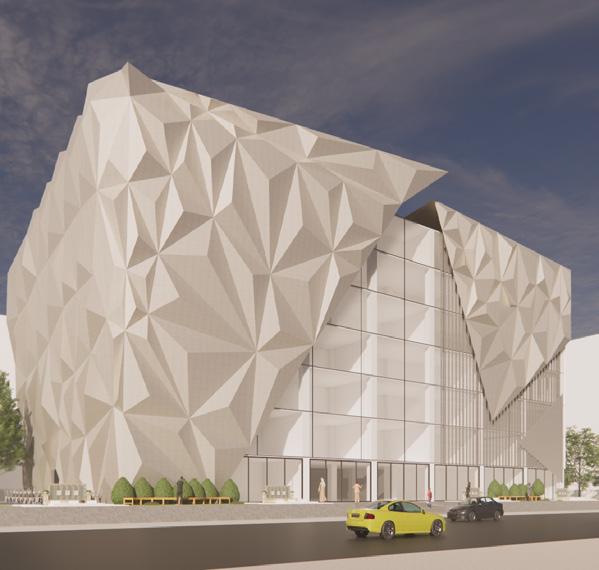 This building’s unique façade, with its bold geometric design, is more than just for looks— it helps bring people together. The sharp, angular shapes mix solid and glass elements, creating a sense of openness and connection. At key spots, the façade opens up to reveal lively social areas, like a bright atrium and shared workspaces. These spaces encourage people to meet, work, and relax, blending office, retail, and leisure into one seamless experience.
