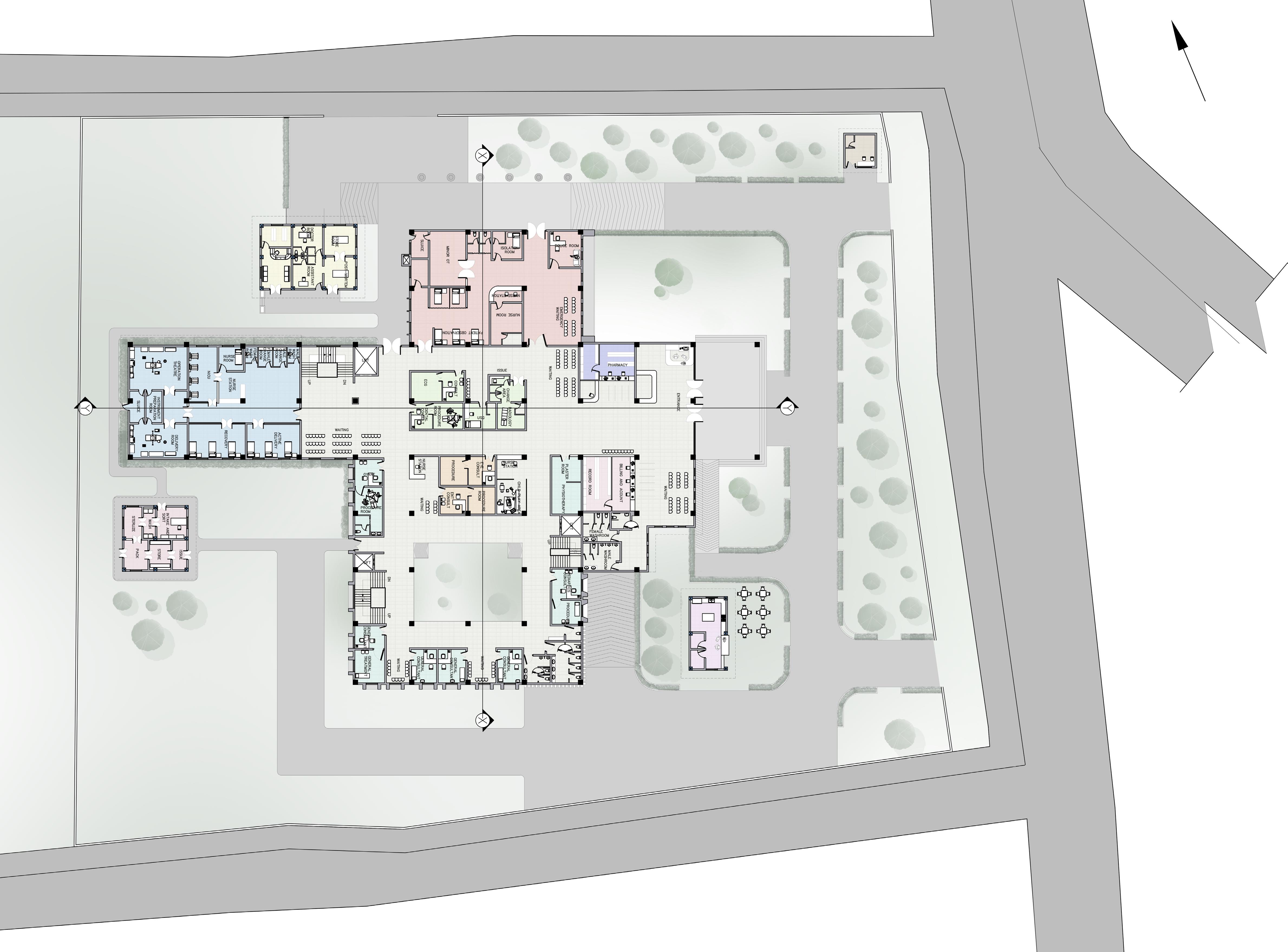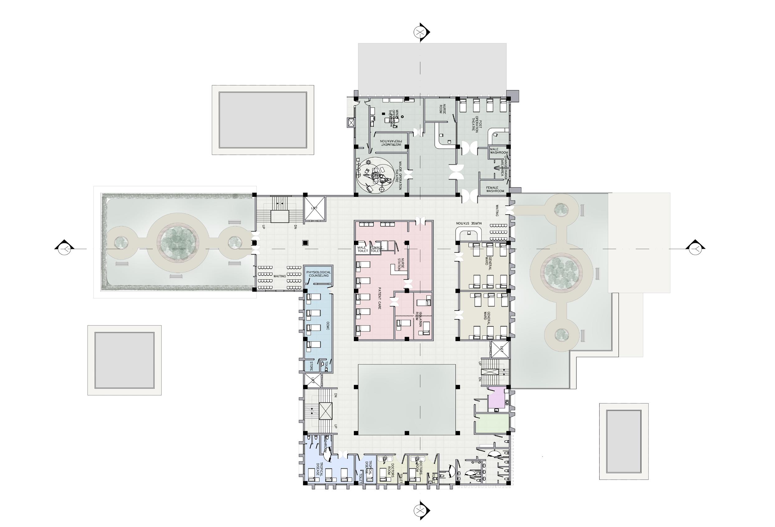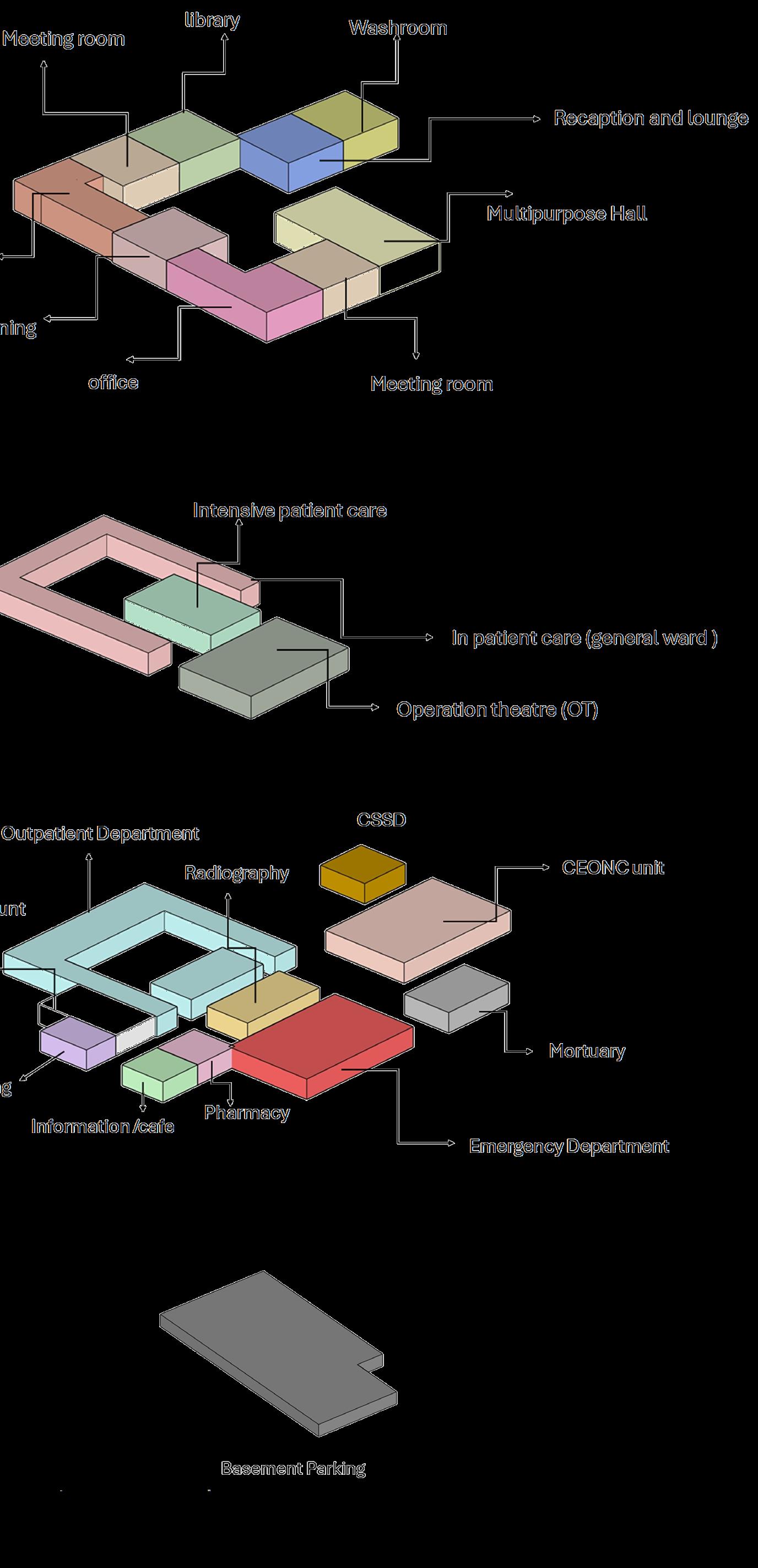 Efficient flow of patients, staff, and resources. Dedicated spaces for key hospital functions. A healing environment with courtyards and green zones for natural light and ventilation.