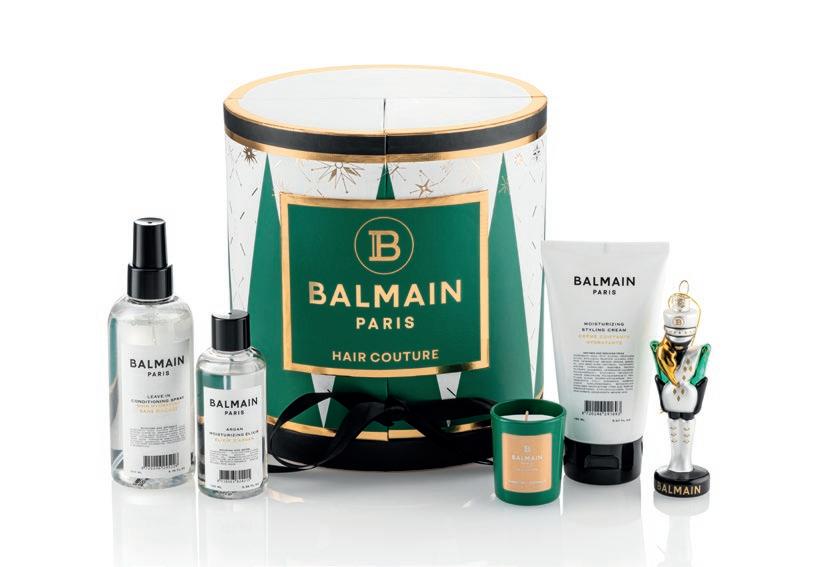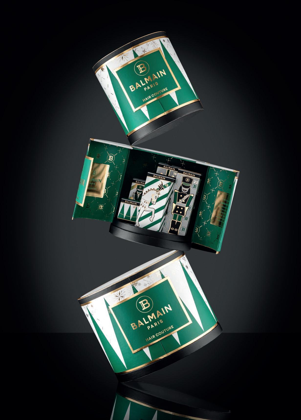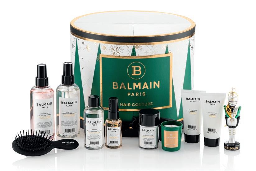 Upea Limited Edition -lahjakalenteri sisältää 10 Balmain Hair Cou ture -lahjaa. Sisältää: Thermal Protection Spray 200 ml, Moistu rizing Shampoo 50 ml, Moisturizing Conditioner 50 ml, Argan Moisturizing Elixir 100 ml, Texturizing Salt Spray 50 ml, Mini De tangling Spa Brush, Leave-In Conditioning Spray 200 ml, Styling Powder, Mini Scented Candle, Nutcracker Christmas -koristeen.