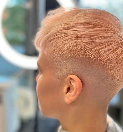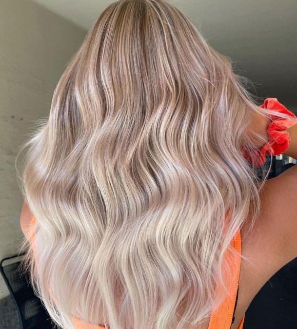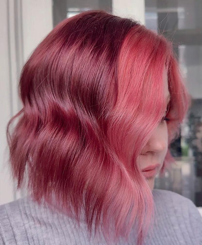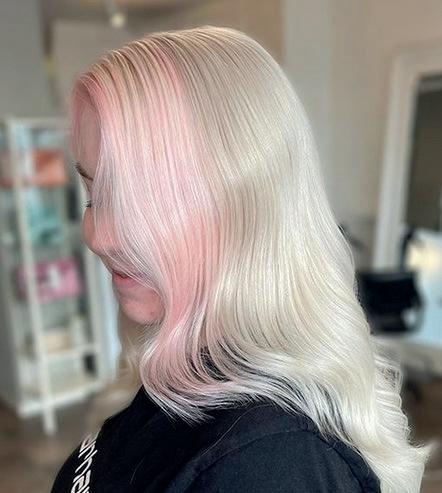 PASTEL PEEKABOO Tyvi värjättiin Special Blonde -sarjan sävyllä 12/66 + 9 % hapete. Taakse toteutettiin vaaleanpunainen osio sekoittamalla T/046 + T/346 keskenään.