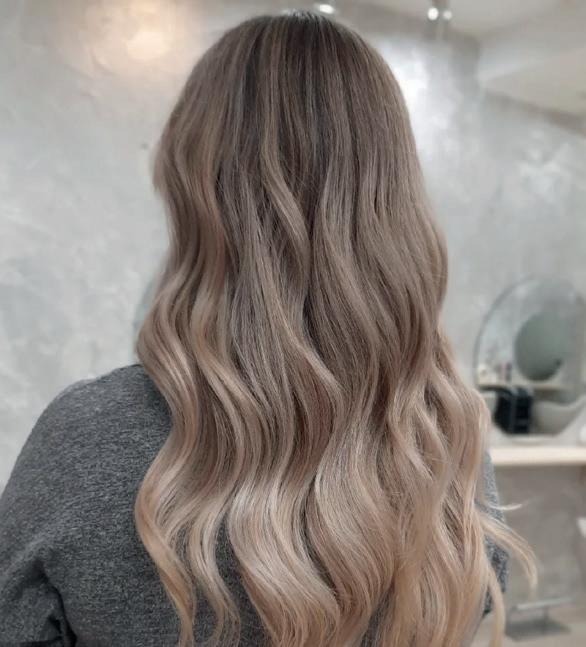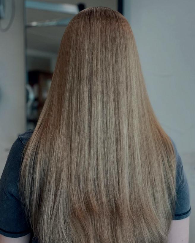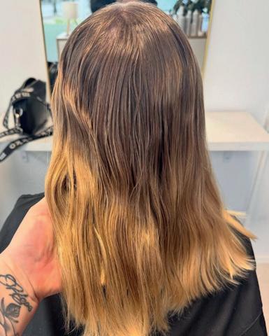 Ruskean eri sävyjä sekoittamalla syntyi kauniin luonnollinen ruskea, tyvellä sävyt 7/7 + 6/74 + 3 % ja pituudet asteen vaaleammalla 8/7 + 7/74 + 2.1 %