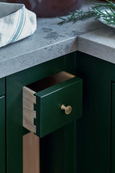 Håndmalede snedkerdetaljer med indenforliggende låge, og brede skuffer og hylder med ribber til åben opbevaring, som har fået en opdatering med klassiske kendetegn. Dette køkken passer ind i både ældre og yngre huse, hvor indretningen har en landlig karakter.