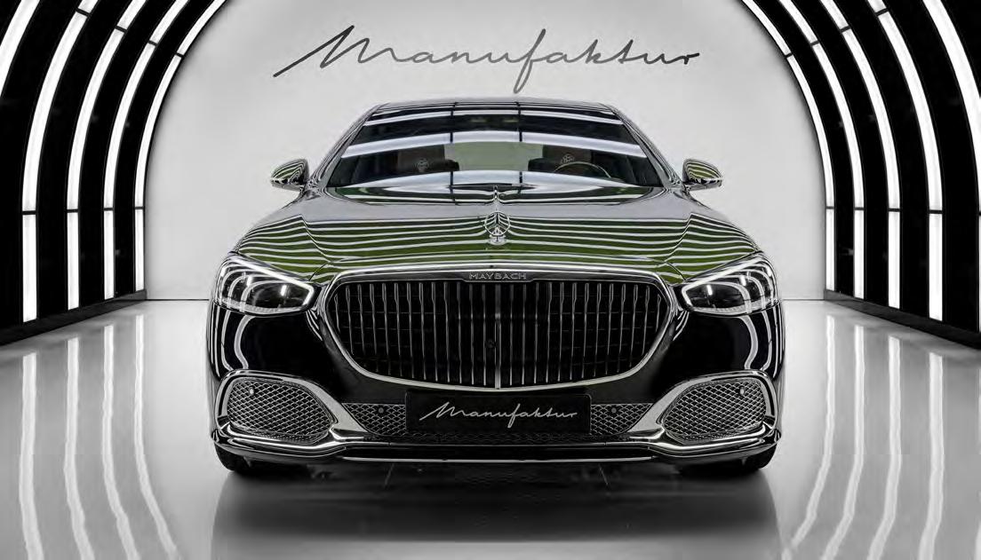 The exterior alone signals its rarity. A meticulously hand-applied twotone finish – Manufaktur olive metallic over obsidian black – accented by a hightech silver pinstripe, takes up to ten days to perfect. Gold-accented Maybach emblems, forged wheels in matching olive metallic and a commemorative “12” medallion crafted in 24-carat gold underscore its bespoke character.