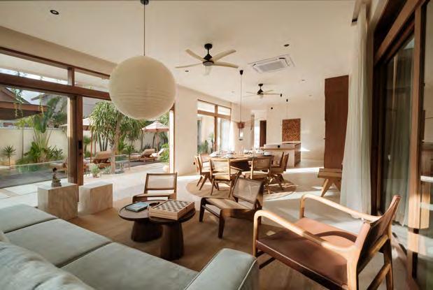 Manu Villas are tucked away in a serene setting between the beach and the cafés and restaurants along Sanur’s main road. They are made for connection, conversation, and Bali’s effortless island lifestyle courtesy THE LUXE NOMAD. Designed for families and groups to gather and celebrate kinship, the private estate houses two stylish villas for a total of seven bedrooms plus two optional bunk rooms featuring four kid-sized beds each. Each space flows effortlessly inside and out through large glass doors; both villas feature a living and dining room on the ground floor that can be fully enclosed and air-conditioned, and an open-air dining zone on the upper floor. Work up a sweat with the gym equipment in the open-air fitness area and take a dip in the invigorating ice bath. Little ones will appreciate the pools with a child-friendly shallow area.