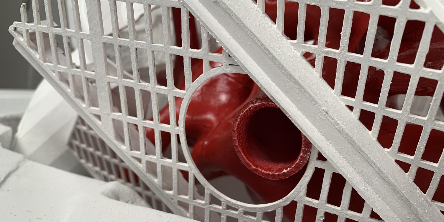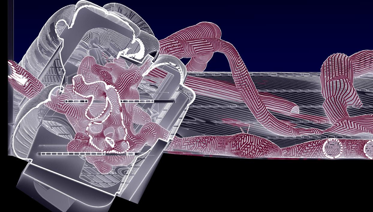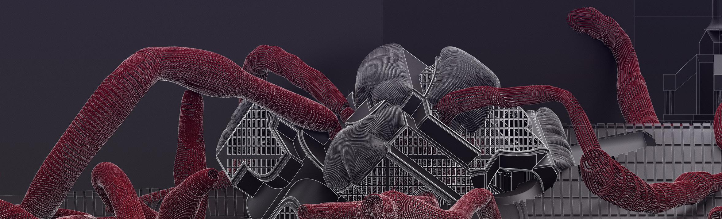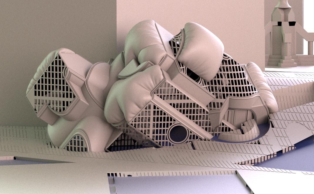 This pavilion is a literal abstraction representing the horrors of war rather than a memorial. It is composed of two main geometries: The exterior cage and the interior pipes or what I called intestines. The intestines are bundled on the interior of the cage. However the cage is unable to contain the intestines as they spill out and effect the rest of the site. This represents how often times we think of war as a contained idea that does not effect us or society but war can spill out and effect society in various ways. Regardless of how much we try to think of war as an isolated idea, the consequences affect the rest of our communities on a local and global scale. Inspired by the work of Anish Kapoor, the intestines are depicted as gruesome with a red color and red splatters on the floor plates and the ground. This represents the realities of war and how it is a gruesome and horrific experience that can harm peoples lives forever. The point of this pavilion is for people to be horrified and nervous of the grotesque consequences war can have not only on an individual but also on a community and society as a whole.