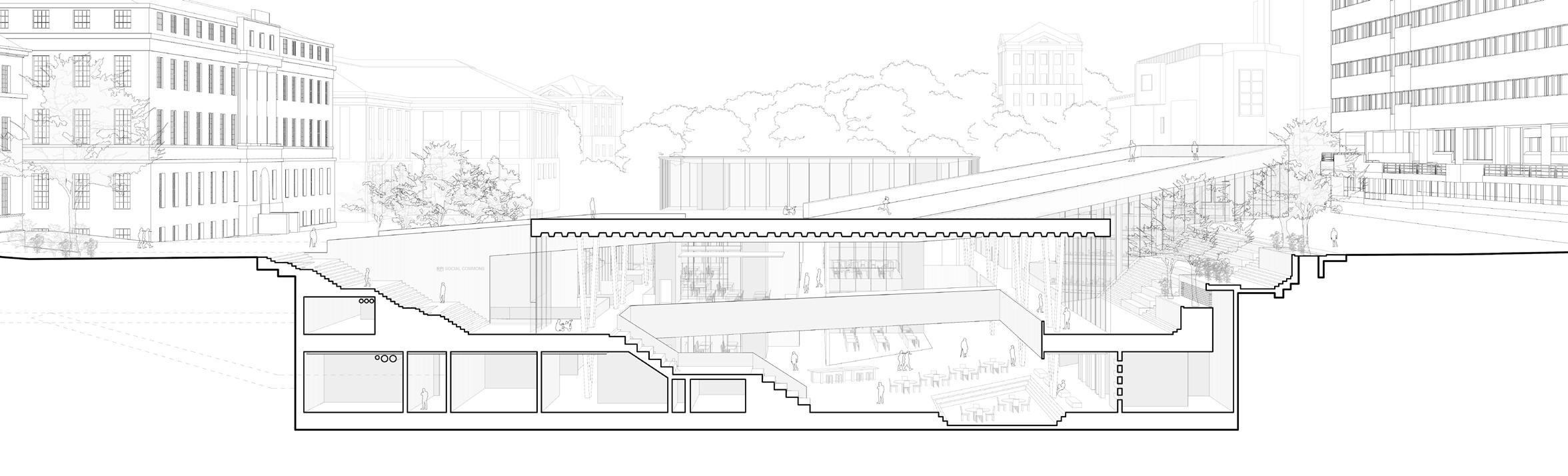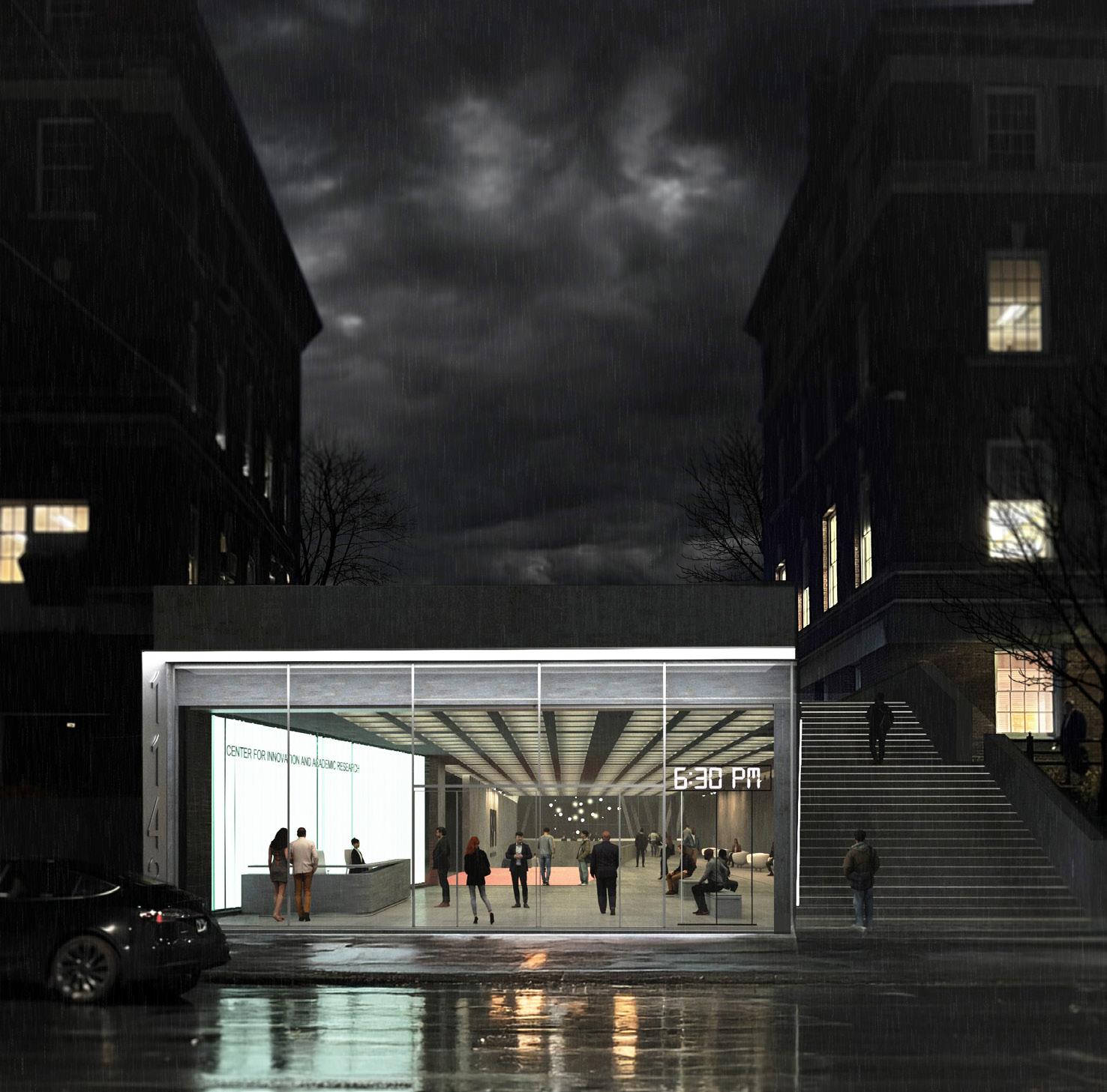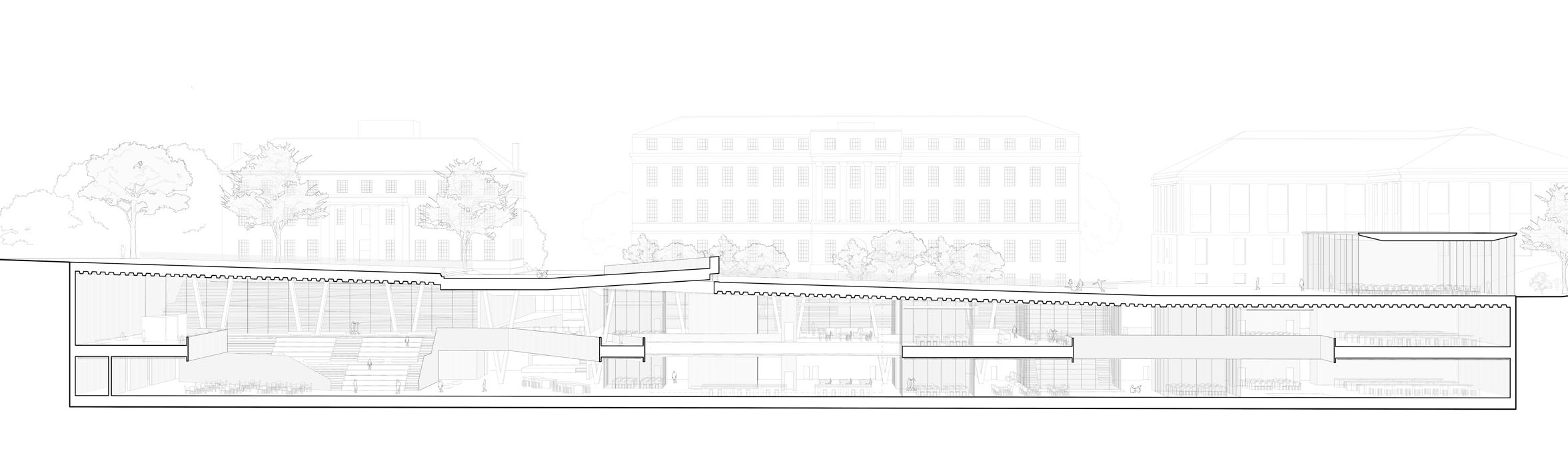 Looking at the history of the RPI campus, the 86 field has always been a space of gathering. Whether that was for events or sporting games, the quad is a significant part of RPI’s history. Our design looks to respond to the existing circulation paths on campus as they converge on the field to create a single, integrated area for student collaboration. This new student center sits beneath the existing 86 field. The main design move is a vessel that provides a pathway from an entrance at Sage Avenue, through the student center and landing on the southern side of the field. The building is also accessible through plazas that frame and respect the existing buildings that surround the 86 field. In terms of program, the student center consists of classrooms, labs, maker spaces, offices, and social lounge areas.