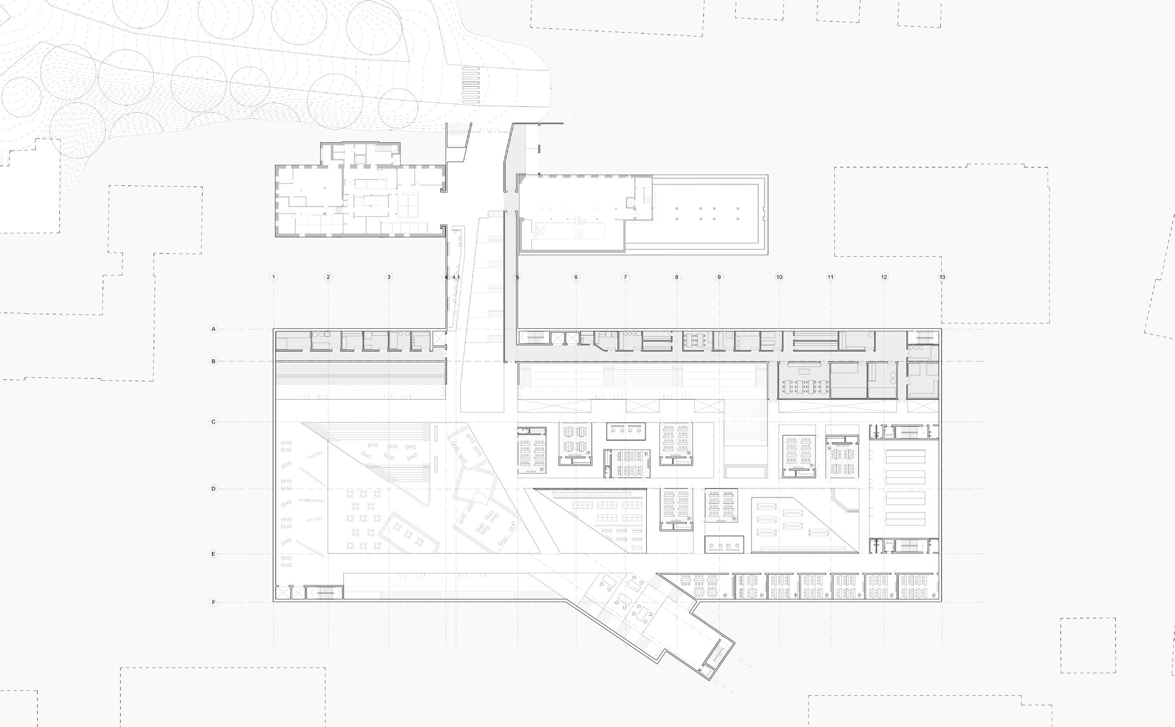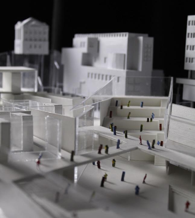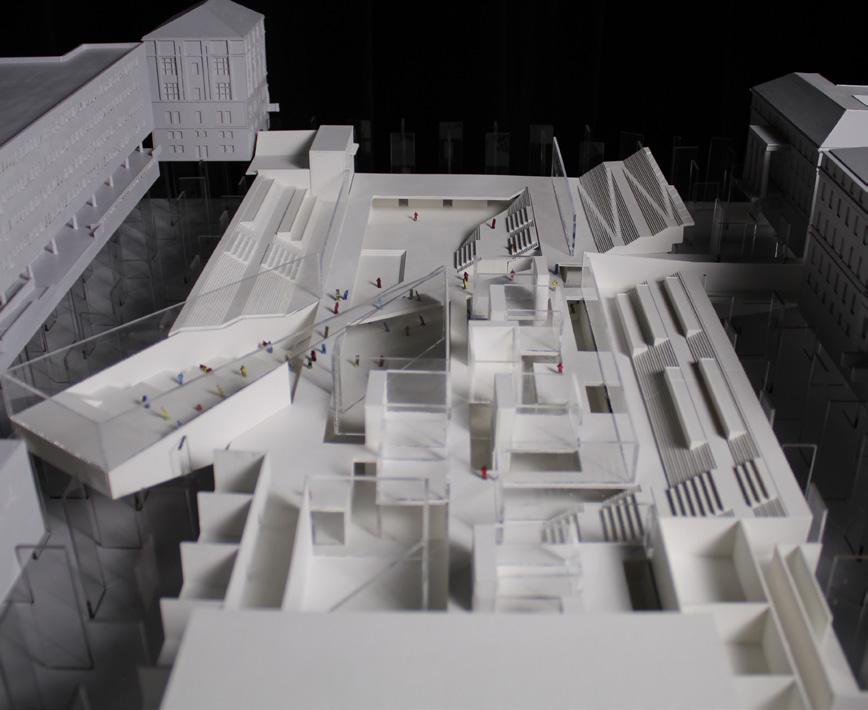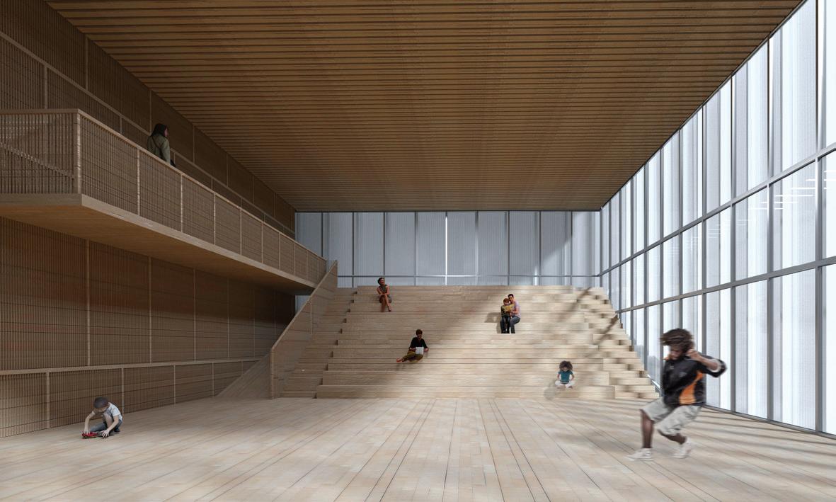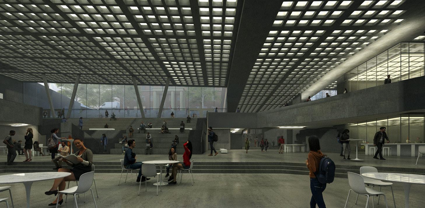 Looking at the history of the RPI campus, the 86 field has always been a space of gathering. Whether that was for events or sporting games, the quad is a significant part of RPI’s history. Our design looks to respond to the existing circulation paths on campus as they converge on the field to create a single, integrated area for student collaboration. This new student center sits beneath the existing 86 field. The main design move is a vessel that provides a pathway from an entrance at Sage Avenue, through the student center and landing on the southern side of the field. The building is also accessible through plazas that frame and respect the existing buildings that surround the 86 field. In terms of program, the student center consists of classrooms, labs, maker spaces, offices, and social lounge areas.