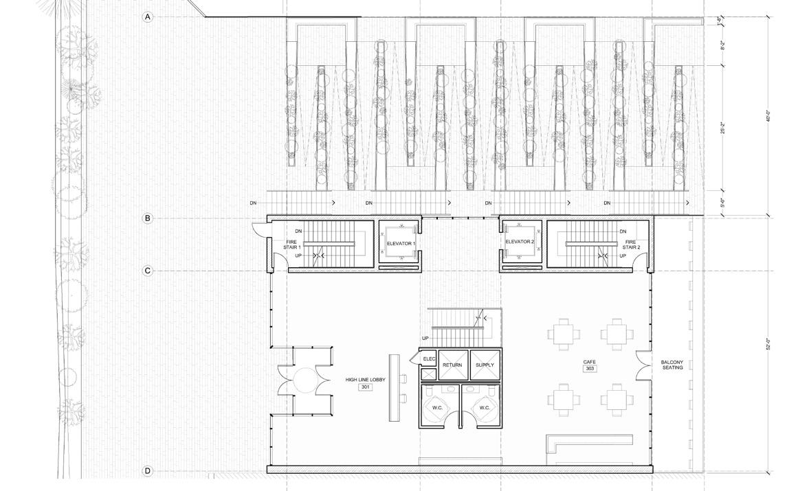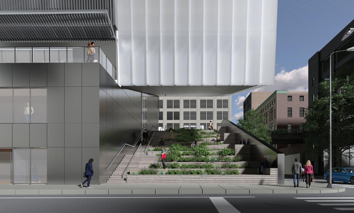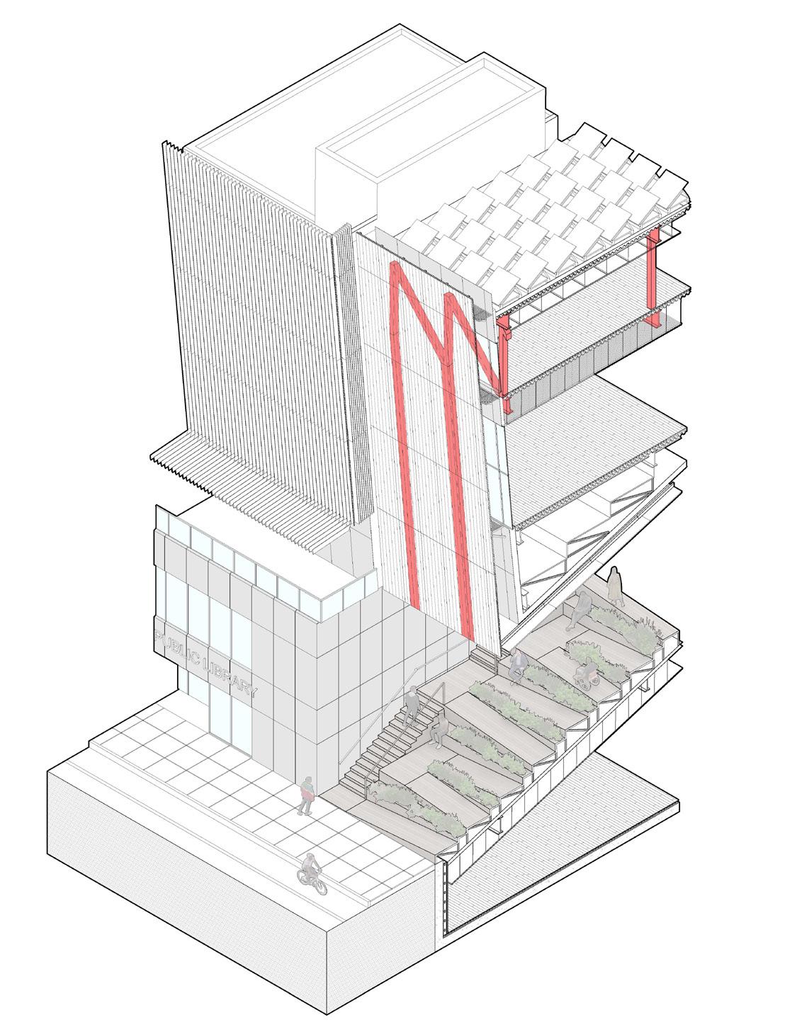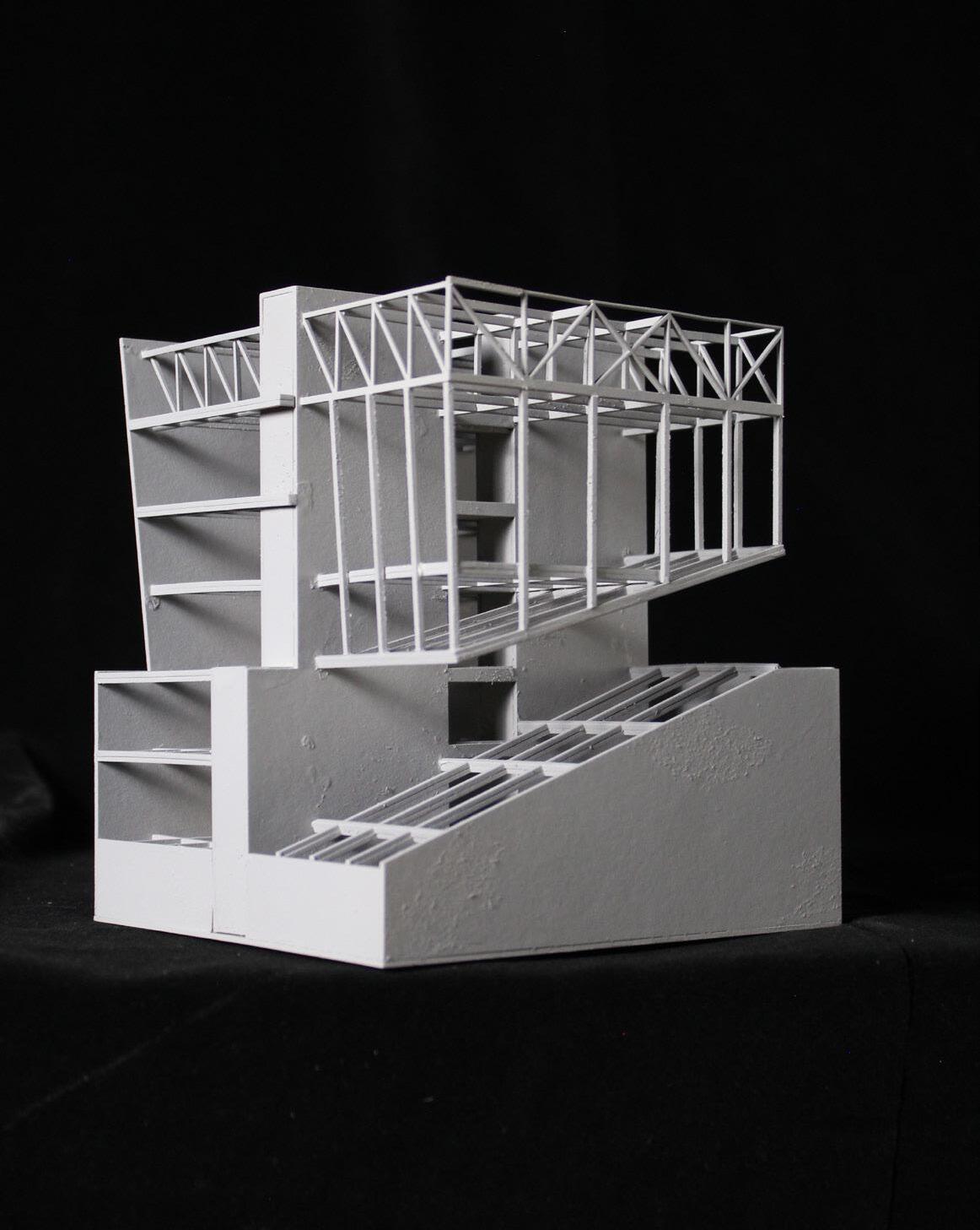 The high line in New York City acts as a point of relief in an otherwise congested city. I wanted to take this same effect and expand on it. The main massing move is a large connection between the high line and 10th Avenue to create an extended ramp system for people to engage with. As a result, the overall parti of the project becomes these two disjoint volumes; one anchored towards the party wall and the other in suspension. Structurally, in order to support the 40’ cantilever created over the ramp, a series of four trusses extend the whole width of the building. To support these trusses, the main stair and elevator cores of the building are placed in the center axis to allow for majority of the load to be transferred through the core walls. This suspended space is the main auditorium. Overall, the project is about the relationship between the exterior move to create the ramp and how that affects the spaces above. There is a clear relationship between the ramp and auditorium spaces in regards to structure, materiality, and program which were the spaces of main focus for this project.