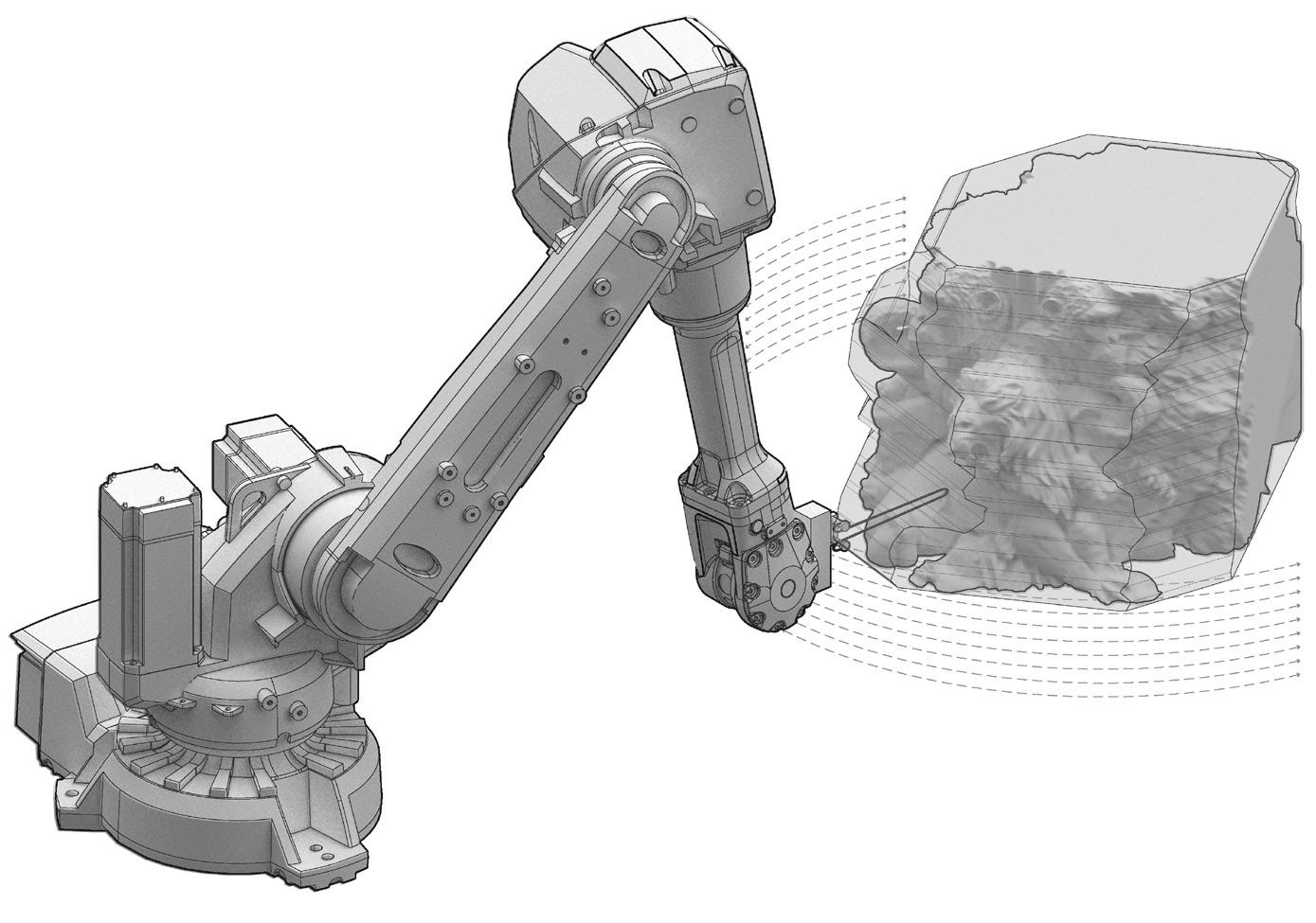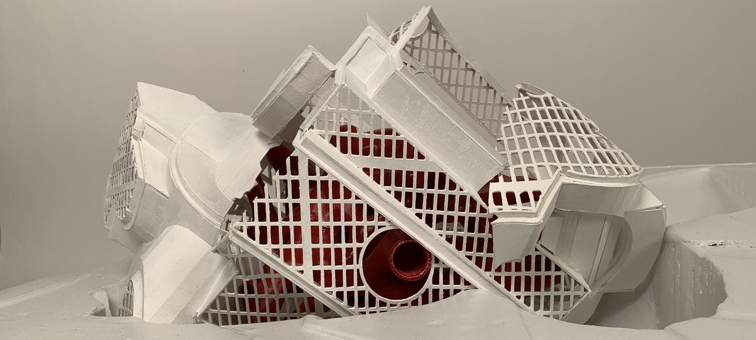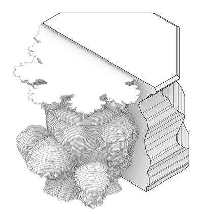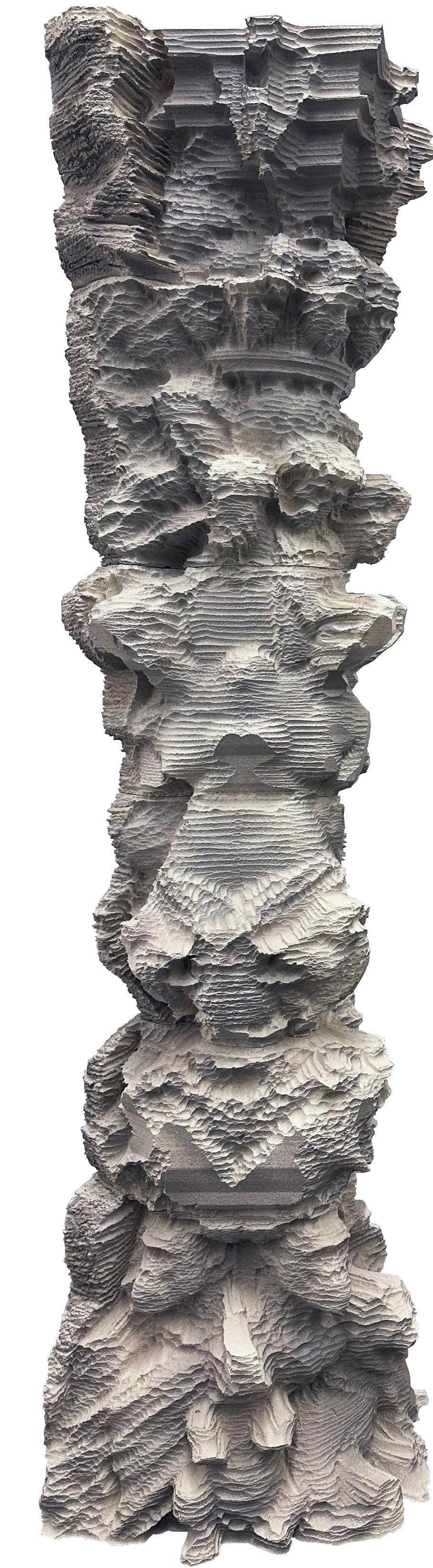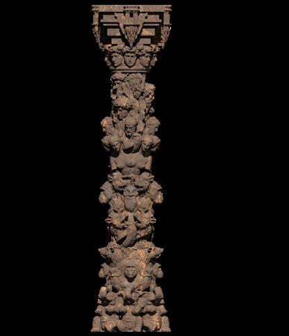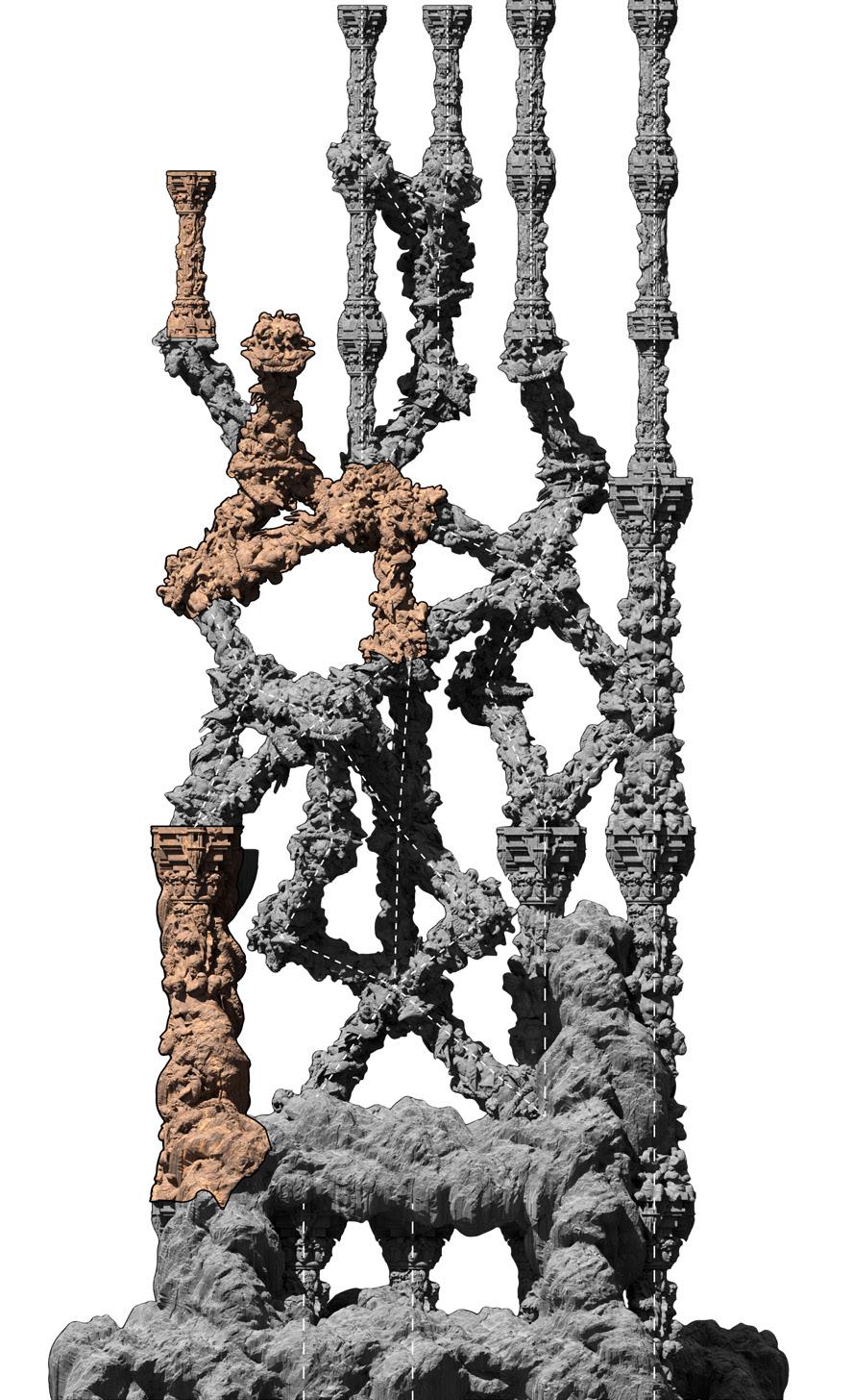 Our assembly of columns is a folly due its purpose of being strictly decorative. When studying ornament, we looked at Hindu Cave Temples. Ornament is not treated as a texture or pattern but by depicting religious or historical scenes through the use of iconographies and figures. This led to the design of our columns. The first is the human column, composed of human faces into the column substructure. Next is the animal column which lacks a substructure as the animals form the entire column. The final column is the hybridization of the two forms of ornament. Making use of both the human and animal forms. This column shows the tension between the two forms of decoration. The traditional human faces which have been seen in Greek and Roman columns is now being taken over by a new form of ornament; animals. Regarding the assembly of the columns, the organization reflects the type of column. The human columns are arranged in only a vertical formation to reflect the traditional order of the column. Meanwhile, the animal column occurs in a free flowing form at oblique angles to break the traditional column grid.