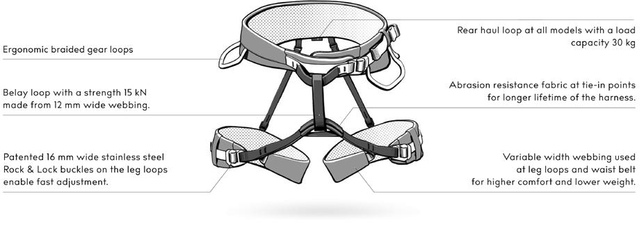 • two large climbing gear loops with a load capacity of 15 kg with a possibility of adjusting the length of the loops
