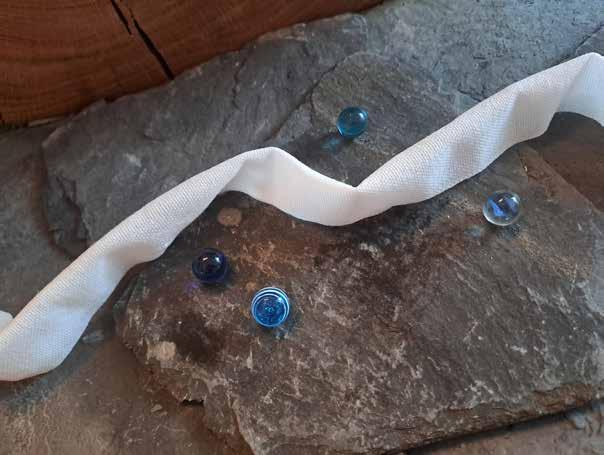 Bereiten Sie einen Tisch vor, an dem alle Platz haben. Legen Sie die Bandage und die Murmeln in die Tischmitte.