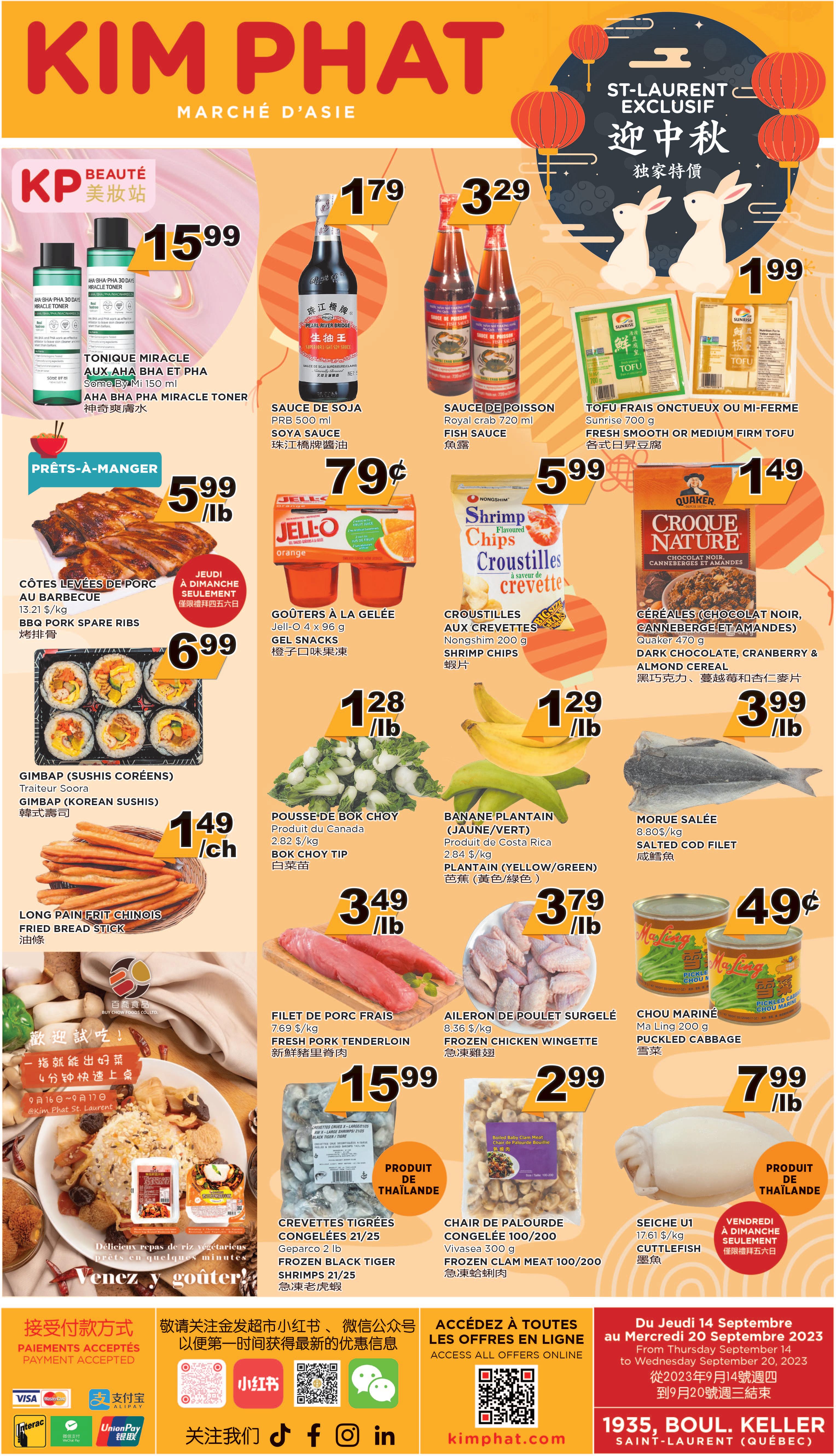 Copyright©2001-2023bySinoQuebecMediaInc. !"#$%"&'()*#+!"&,-.',/0., (!,12!3),45 +267,',$289823),/0,+267,/0/: +7';<!82"7 !"#$%&'#&(%)#&#)&*#)"# Mooncake on sale 各式月饼上市 +),-.&/0$)'& 菜油 12 799 ea/ch +) -. /0$)' +),,- /0$) 1799 ea/ch /."$)&/0$)'& 圆米 &34(5& ÉPICERIE / GROCERY 1599+tax ea/ch !"#$%&' 炒锅 ()&$ *!+,-'."#/0' 新加坡咖喱 1))$2 3#445'67+!/%8'."#/0' 银丝米粉 ())9 :;<'."#/0' 芦荟水 =))$2 99¢ ea/ch 169 ea/ch >2!47#/?-'."#/0' 椰浆 1))$2 @%/9'@#7'."#/0' 双黄莲蓉 月饼 A1)9 @#%'@#%' 粉丝 =))9 199 ea/ch B+20!/'CD#22+D' 东莞米粉 1))9 299 ea/ch +&E'."#/0' 烧鸡酱/春卷酱 F=)$2GA))$2 799 ea/ch H%/I!/9'."#/0' 茶系列 J=)9GKF)9 299 ea/ch ;D+/9'3L/9'C!/9' ."#/0' 酱油 'FM)$2 @%/9'@#7'."#/0' 五仁月饼 A1)9 5288 ea/ch @%/9'@#7'."#/0' 红豆沙 双黄月饼 'A1)9 5388 @%/9'@#7'."#/0' 双黄低糖 月饼 'A1)9 5588 ea/ch @%/9'@#7'."#/0 蛋黄月饼 'A1)9 88¢ ea/ch FOURNITURES POUR / RESTAURANT SUPPLIES CONGELÉ / FROZEN 399 !"#$ %&'' ea/ch C!#-+L2'."#/0' 熟虾仁 'J))NK))' (1)9 O%P#'-!#'."#/0' 螺肉 '(1) TAAURAN A AURAANNT 2/500 !"#$(&'' 白虾 'KFN() 9000 case boîte 龙利鱼柳 '12Q8F 11999 case boîte *R.' 春卷 K=981)4&-8J)Q+8!2499 boîte Produits du Mexique 上海白 3299 case boîte À partir de 10lb 10lb and up 359 lb 鸡胸肉 Aire de restauration / Food court $599 !"#$)&'' !*+,-.+ /0-1-22- 3042 5678.942-: <"%!0'C7"%$4'S+22'TU5/#$%?!V'M4&9 & V M4 5/#$%?!V $ TU S+2 4 %! 7 0'CC7"% "% 5 + 0 C S !0 " "%!!0' " $ S++22'TUU5/##$%?%?!?!V !V 4&$699 !"#$)&'' ;+;<4 ;7.==;.+9*8 >+;<4 $399 !"#$%&'' !*+,-.+ ?*820-., ?*820-., !*,, @A-; $599 !"#$)&'' !*+,-.+ BC*-4, B+ B0.#*8 U"#9+/'!5!'"+22'F4&D0*9*24*8 B+ E-8 .+ B49 304&F>.2&F>+8& *8,7 椒盐豆腐 炸鳕鱼段 699 !"#$)&'' portion 什菜豆腐 咕咾肉 炸小鸡腿 599 !"#$G&'' portio 5/299 !"#$ %FG&'' 549 !"#$%&'' ea/ch 2/500 299 ea/ch ;%"%/'."#/0' 午后红茶 'JW=X ax <%"!'C?#"'."#/0' 煤气 18KKA9 399+tax ea/ch 62#?%/L$'."#/0' 蛋挞皮 ()8K=9 O R RES P 799 !"#$'&'' ea/ch 龙利鱼柳 '1))9 268 !"#$ H&'' ea/ch 7!I'-7L+'."#/0' 道口烧鸡/肘 子 =Y=9GJ)K)9 1199 !"#$ I(&'' ea/ch ;+/+'."#/0' 青口 'M))9 ea/ch !"#$ IJ&'' 899 1/100 !"#$ IFI&%K Z+5'-7#"!'Q"#/0' 红薯粉丝 FM)9 @# *!+,-'."#/0' 冬瓜茶/菊花茶 K=)$8F 2/5 129 ea/ch 5588 ea/ch 5388 ea/ch XEE 蠔油 F81WM=2Q4299 case boîte 6!#"2'S%P!"'."%09!' ."#/0' 味精 '=)2Q 5799 ea/ch XEE'6#/0#' 熊猫蠔油 KWKAE98F 5600 ea/ch <L'5#/9'."#/0' 虾仁 AJNY)'1))9 ea/ch !"#$ G&'' 599 boîte case 1999 Produits du Quebec 芽菜 2699 boîte Produit d Québec 粗长椒 1599 case boîte Produits de la Chine 白萝卜 3599 case boîte Produits de la Chine 海鲜菇 2499 boîte Produits du Mexique 富贵花 259 Ib À partir de 20lb 20lb and up 猪排骨 : 3/299 7#+E+7'."#/0' 椰子水 =))$2 128 !"#$H&'' ea/ch 359"#0!'."#/0' 肠仔 '1=)9 ! ea/ch a/c 丝 0 Z*[' 黑芝麻沙琪玛 F)M9 299 ea/ch 99¢ ea/ch Nous n'acceptons pas les règlements par Carte de Crédit International;carte PrePaid;carte cadeau;Américan Express We do not accept payment by International credit card, prepaid card, gift card, American Express 4//00,=%!;>, <!82"7)2" $%"78?<;,@A,B5C,4$D2;>E,F45'::G':FFF H<IE,F45'::4'0GGG Jusqu' à épuisement des stocks! ST- LAURENT 广告如有印刷错误请以店内标签为准。所有特价产品数量有限,售完即止。C&T超市保留广告最终解释权。 J.);2,@!<"7)7)2K, <K7,L S We are hiring all departements, experience is an asset Tel: 514 653 6096 On embauche pour tous les departements avec bon salaire, les personnes avec experience ont la priorite. Tel: 514 653 6096 6.%7,)8$)9&50$)' 黑米 :(5 ea/ch 599 ;($",)%<&/0$)'& 榴莲肉 &:4:9 999 ea/ch M?NE,4/>-7 ea/ch 1799 ea/ch =,)8#)9&/0$)' 冰片糖 &:4:9 3/269 ; 499 ea/ch >,)9?,)9&/0$)'& 面系列 @A9 B).00& 鸡粉 3A9 866 ea/ch 米 >,) @A :9 999 M?NE4F>-ea/ch 白虾 13C:D&@(5 香蕉叶 :4:9 99¢ M?NE,4>:ea/ch 799 ea/ch 6E6& 圆糯米 &@A9 杯面 F49?G& 799 ea/ch 无骨羊肉 499 M?NE,44>-$11.00/kg Ib 白 ea/ch M?NEG>-499 O9.&/0$)'& 酸奶 3G?3DD9 布丁 :@:9 88¢ M?NE,/>-ea/ch 沙拉酱 F4D<( 99¢ M?NE,:>-ea/ch 池鱼 299 M?NE:>-$6.59/kg Ib 三文鱼扒 599 M?NEP>-$13.21/kg Ib 瓜子鲳 279 M?NE:>-$6.15/kg Ib 马友鱼 199 M?NE:>-$4.39/kg Ib 马友 友鱼 POISSON / SEAFOOD Fruits et Légumes / Fruits & Vegetable VIANDE / MEAT EA 上海白 88¢ M?NE,4>Flb $1.94/kg Produits du Mexique 牛百叶 499 M?NEF>-$11.00/kg Ib 冰鸭 1699 M?NE,:/>-ea/ch ab 富贵花 Produits du Mexique 西芹 Produits du Mexique 粗长椒 199 M?NE/>-lb $4.39/kg Produi du Quebec 129 M?NE,4>-/ch 白萝卜 Produits de la Chine 39¢ lb $0.86/kg M?NE,0>-海鲜菇 Produits de la Chin 2/200 M?NE/Q5>00 99¢ lb $2.18/kg M?NE,/>/鸭 冻猪肚 149 M?NE,5>-$3.29/kg Ib 肚 DE 里脊肉 188 M?NE,:>-$4.15/kg Ib 百 肥牛 699 M?NE,R>-$15.41/kg Ib h 209 M?NE,5>-$4.61/kg Ib 鸡翅 袋装牛油果 Produit du mexique 299 M?NE,:>Fea/ch 即食椰青 Produits de chine 2/700 M?NE5>-Jusqu' à épuisemen des stocks 售完即止 179 lb $3.95/kg M?NE,/>F袋装橘子 Produit d Mexique A)89!;<)82,32,$<89.?,AD,+7';<!82"7QH;S28,T%8,$<89.?,AD,+7';<!82"7