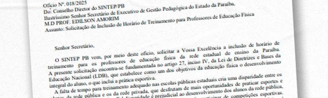 AdiretoriadoSINTEPenviouoícioedialogoucom osecretáriodeGestãoPedagógica,EdilsonAmorim, sobreoretornodacargahoráriadetreinamento paraosproissionaisdeEducaçãoFísicadarede estadual. A solicitação está fundamentada no artigo27,incisoIV,daLei deDiretrizeseBases da Educação Nacional (LDB), que estabelece como um dos objetivos da Educação Física o desenvolvimento integral do aluno, incluindo a práticaesportiva.
