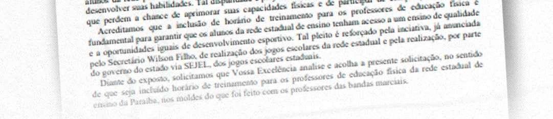 O sindicato solicitou ao secretário uma análise da presente demanda, pois é fundamental para garantir que os alunos da rede estadual de ensinotenhamacessoaumensinodequalidade e a oportunidades iguais de desenvolvimento esportivo.Essepedidoéreforçadopelainiciativa, já anunciada pelo secretário Wilson Filho, de realizaçãodosJogosEscolaresdaredeestaduale pelaexecução,porpartedogovernodoestadovia SEJEL,dosJogosEscolaresEstaduais.Asugestão dessa inclusão é que seja nos moldes adotados paraosprofessoresdasbandasmarciais.