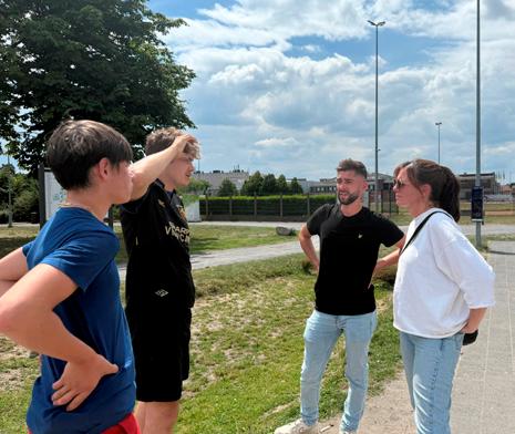 Jongerencoördinator Sarah en jongereninspecteur Anthony in gesprek met jongeren aan De Witte Molen.