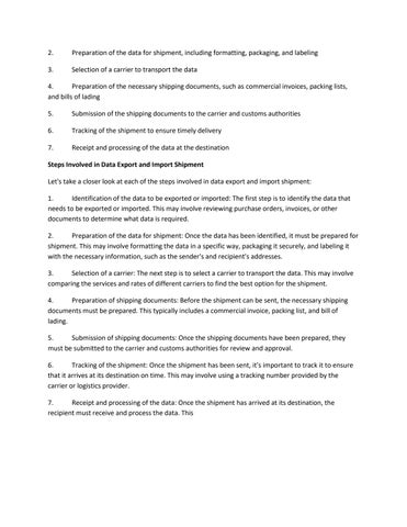 Data export and import shipment refer to the process of moving data from one location to another. This can be done electronically or physically, depending on the nature of the data and the requirements of the parties involved. Examples of data that are commonly exported and imported include invoices, purchase orders, customer information, and product specifications.