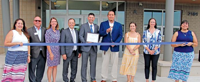 L to R: LeAnn Bennett, Dan Kippley, Nan Kelly (president, Sioux Falls School Board), Dr. Jamie Nold (superintendent, Sioux Falls School District), Patrick Purdy (principal, Marcella LeBeau Elementary), Ryman Lebeau (chairman, Cheyenne River Sioux Tribe), Taryn Latza, Melissa Dellman and Johanna Farmer.