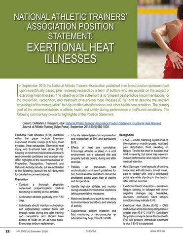 n September 2015 the National Athletic Trainers’ Association published their latest position statement built upon scientifically based, peer reviewed research by a team of authors who are experts on the subject of exertional heat illnesses. The objective of the statement is to “present best-practice recommendations for the prevention, recognition, and treatment of exertional heat illnesses (EHIs) and to describe the relevant physiology of thermoregulation” to help certified athletic trainers and other health care providers. The primary goal of the recommendations is athlete health and safety during performance in hot/humid conditions. The following commentary presents highlights of the Position Statement. Casa D, DeMartini J, Yeargin S, et al. National Athletic Trainers’ Association Position Statement: Exertional Heat Illnesses. Journal of Athletic Training (Allen Press). September 2015;50(9):986-1000.