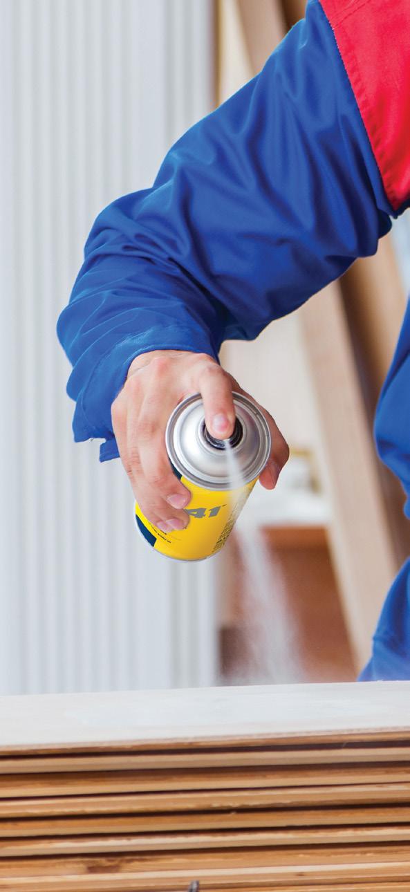 OB41 Fast Tack Contact Adhesive Spray bonds a wide variety of substrates including wood, concrete, stone, tiles, rubber, foam, metals, rigid plastics, polyethylene, canvas fabrics, carpet, cardboard, paper and cork. Its variable spray nozzle allows for ergonomic finger-tip control during spray application.
