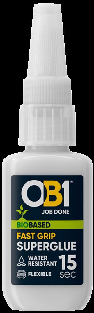 It is a flexible liquid formula with exceptional resistance to water and humidity as well as instantly setting within 15 seconds. OB1® BioBased Fast Grip Superglue has excellent bonding properties to a very broad range of materials, including woods, metals, plastics and elastomers. The ultra strong formula is made up of 60% biobased content and is also odourless.