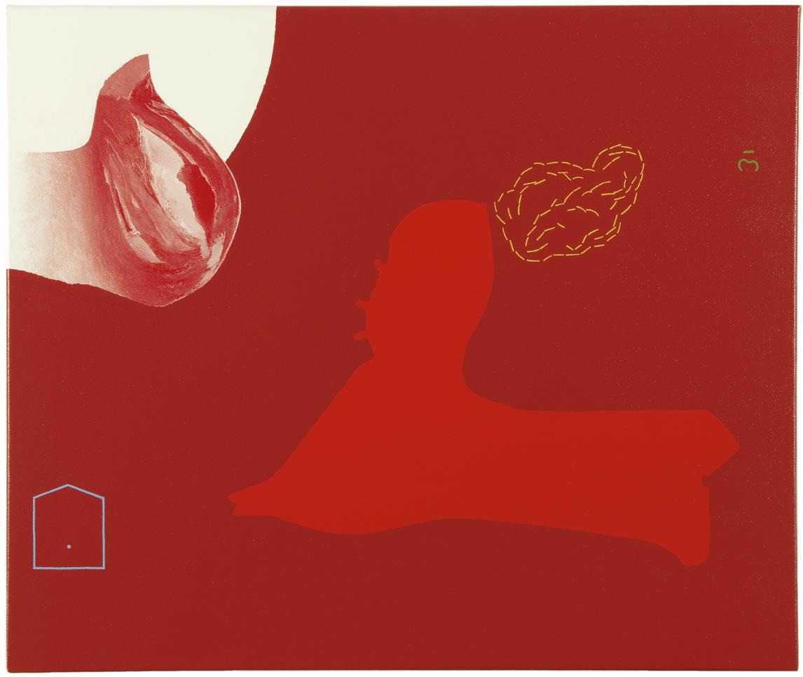 Sim, tanto na acepção ramos-rosiana quanto na levinassiana, a pintura de Fala Mariam é elemental: são figuras pré-objectivas e pré-subjectivas, dispondo-se num «meio» incontível. Mesmo nos elementos nitidamente recortados sobre fundo liso: mesmo aí — por exemplo, na pintura lá fora (Fig. ), a figura larvar ao centro, vermelho-alaranjada, como que emana do «meio» onde tudo banha e, a qualquer momento, se pode afundar em definitivo. A anterioridade liquefeita desta pintura, a que me referi logo de início, é justamente a manifestação geral do «meio»: «o elemento não tem formas que o contenham», diz ainda Lévinas, à semelhança da matéria em estado líquido cuja forma é unicamente determinada pelo objecto que a contém.