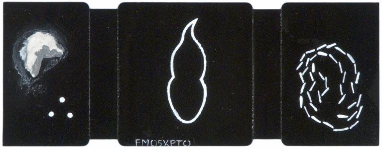 A série intitulada XPTO (abreviatura do nome «Cristo», em grego) resulta da planificação de seis caixas de cigarrilhas (Figs. -). Sobre um negrume opaco, abrem-se formas dilaceradas. Cada tríptico é uma espécie de sepulcro vazio e espalmado, após a combustão integral: a arte é a única ressurreição dos corpos. Estamos à beira da religião — sim, mas a arte recua ou, melhor, permanece — firmemente — face ao negro dilacerante que possibilitou tanto ela própria, a arte, como a religião.