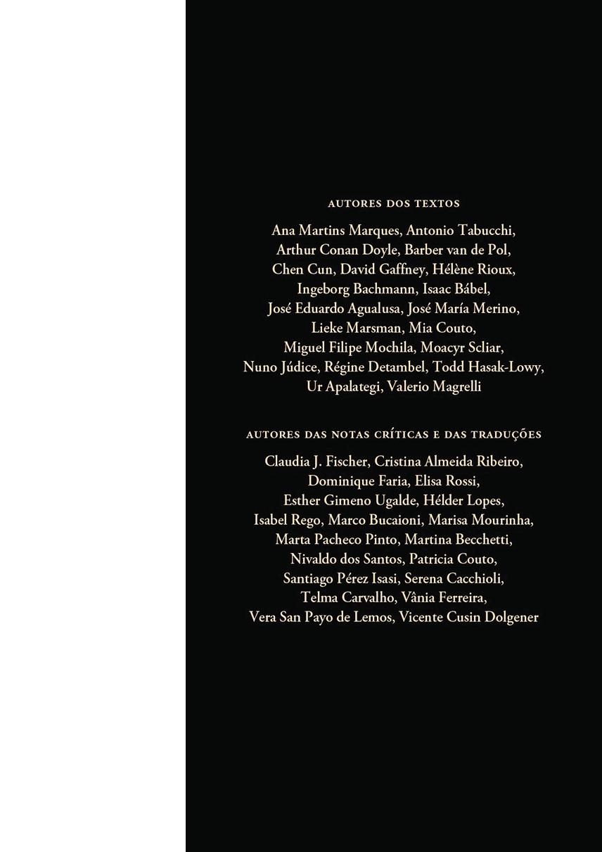 Um agradecimento muito especial à Samantha Dal Cin e à Stefania Perozzo, que, enquanto mestrandas da Università Ca’ Foscari, de Veneza, prepararam durante o seu período de estágio no Centro de Estudos Comparatistas, entre Abril e Maio de 2021, a tradução portuguesa de um conto sugerido pela investigadora Joana Moura. Infelizmente não nos é possível incluí-la neste livro, por não obtenção da permissão para a sua publicação. Um reconhecimento é ainda devido à Elisa Mariotti, pelo seu trabalho de apoio à transcrição e revisão de texto no âmbito do estágio Erasmus+ que também desenvolveu no Centro de Estudos Comparatistas, de Julho a Setembro de 2021.