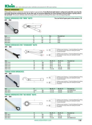 TORQUE WRENCHES While setting a tool it is extremely important to tighten it appropriately. If not effectively tight indeed a cutting tool could slide away from the tool holder during the working process. On the other side, an excessive tightening can cause damages to the tool holder or spring collet or the tool itself. The wrench indicates when the torque (Nm) is reached according to the value in the corresponding table.