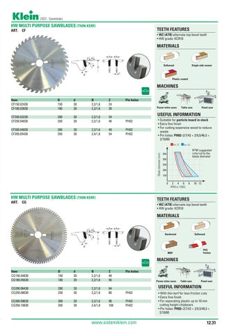 USEFUL INFORMATION • Suitable for particle board in stack • Extra fine finish • For cutting expensive wood to reduce waste • Pin holes: PH02=2/7/42 + 2/9,5/46,5 + 2/10/60 RPM suggested referred to the blade diameter