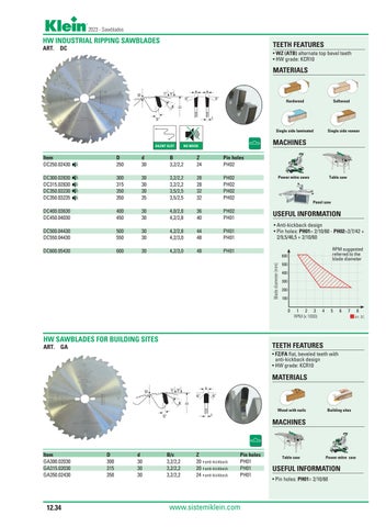 USEFUL INFORMATION • Anti-kickback design • Pin holes: PH01= 2/10/60 - PH02=2/7/42 + 2/9,5/46,5 + 2/10/60 RPM suggested referred to the blade diameter
