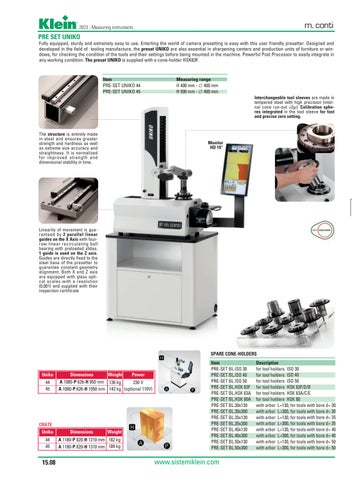 PRE SET UNIKO Fully equipped, sturdy and extremely easy to use. Enterting the world of camera presetting is easy with this user friendly presetter. Designed and developed in the field of tooling manufacture, the preset UNIKO are also essential in sharpening centers and production units of furniture or windows, for checking the condition of the tools and their settings before being mounted in the machine. Powerful Post Processor to easily integrate in any working condition. The preset UNIKO is supplied with a cone-holder HSK63F.