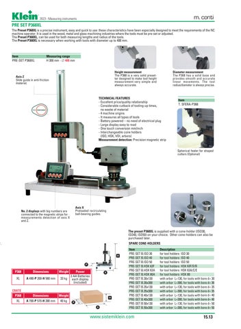 PRE SET P368XL The Preset P368XL is a precise instrument, easy and quick to use: these characteristics have been especially designed to meet the requirements of the NC machine operator. It is used in the wood, metal and glass machining industries where the tools must be pre-set or adjusted. The Preset P368XL, can be used for both measuring lengths and radius of the tools. The Preset P368XL is necessary when working with tools with diameter up to 400 mm.