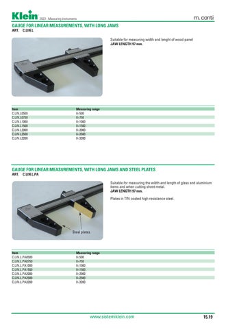 GAUGE FOR LINEAR MEASUREMENTS, WITH LONG JAWS AND STEEL PLATES ART. C.LIN.L.PA Suitable for measuring the width and length of glass and aluminium items and when cutting sheet metal. JAW LENGTH 97 mm. Plates in TIN coated high resistance steel.