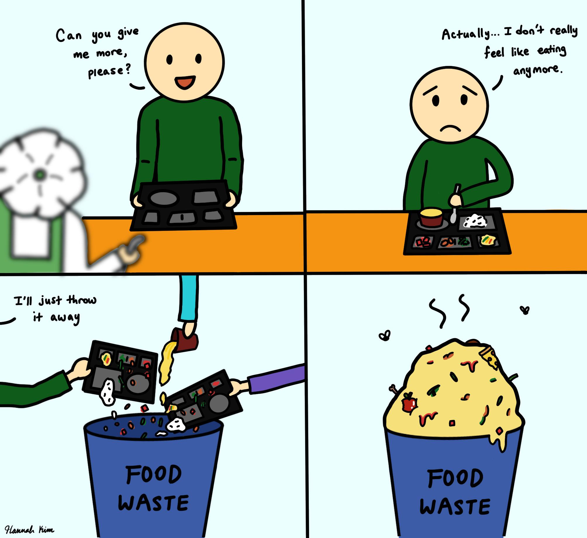 Obviously, the easiest way the school can reduce its waste is for the students to finish the food that they take. How ever, students are unlikely to completely eliminate their food waste. So, what can the school do to help alleviate the problem? One of the more feasible solu tions is creating smaller serving sizes in the cafeteria. This would ensure that any student who does not finish their food would waste less of it and that any student who eats more than the smaller serving proportion could simply get a second serving.