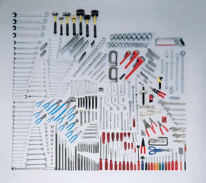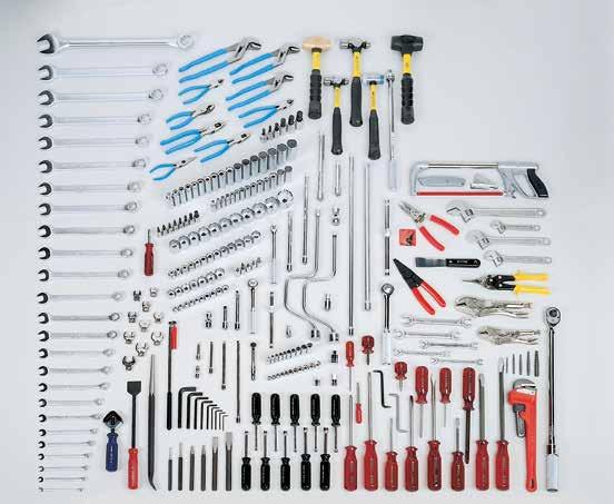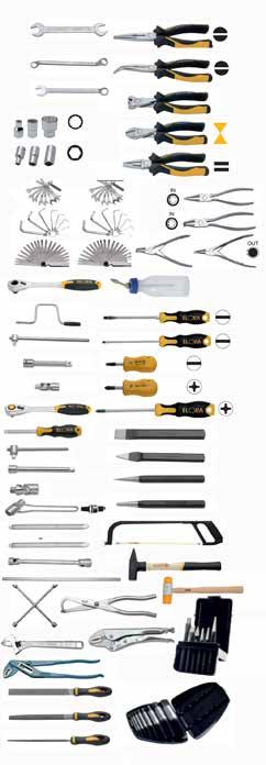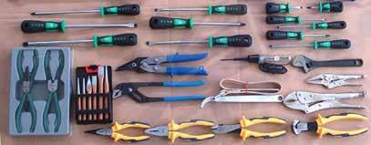Straight Nose Plier for External Rings, Straight Nose Plier for Internal Rings, Bent Nose Plier 90° for External Rings, Bent Nose Plier 90° for Internal Rings, Straight Jaw Locking Plier 10", Aviation Snip-Straight 250mm, Claw Hammer 454grm, Ball Pein Hammer 227grm & 454 grm, Drilling Hammer 1135grm, Soft Faced Hammer 454grm & 680grm, Magnetic Parts Tray