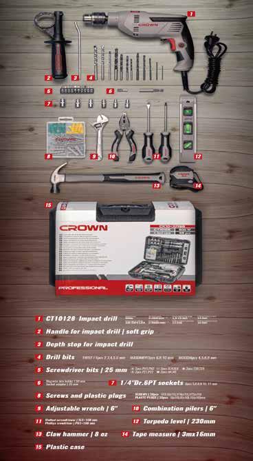 • 1/4” Dr. 72 Teeth Flex Head Ratchet 170mm, 1/4” Dr. Extension Bar 50mm, 1/4” Dr. Socket Driver 140mm, 1/4” Dr. 72 Teeth Reversible Ratchet 130mm, 3/8” Dr. Hinge Handle 230mm, 3/8” Dr. Speed Handle 400mm,