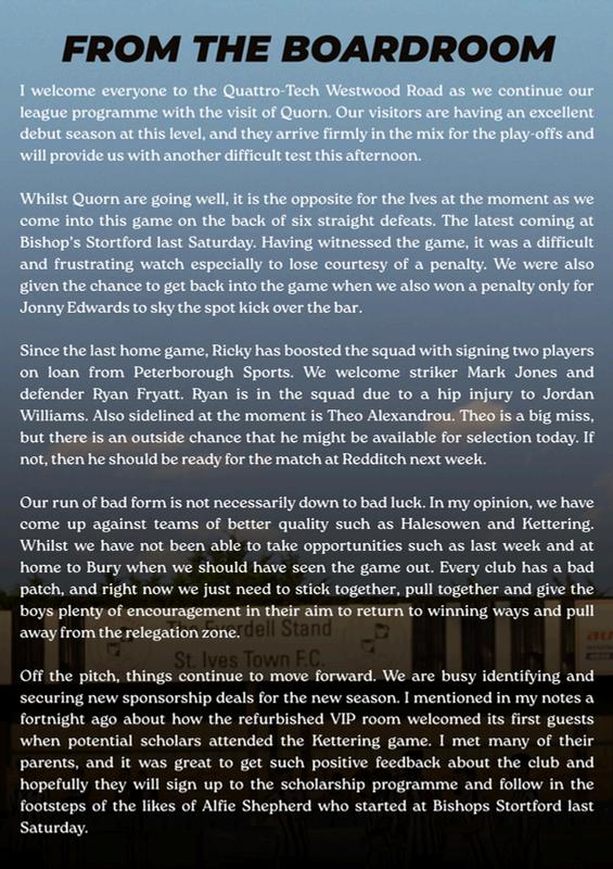 Today’s opponents have made a superb start to life at step three following their successful campaign in the Northern Premier League Midlands Division last season, which saw the Reds crowned champions with 103 points. Quorn currently sit sixth in the Southern League Premier Division Central with 50 points to their name, having spent plenty of time in the league’s top four spots. Manager Ryan Beswick’s side don’t tend to draw many, with his men taking 45 out of their 50 points from wins, drawing five and losing 11 in their opening 31 games this season. With the midlands outfit sitting just a single point behind the promotion places, it’s exciting times for the Quorn faithful, who will be hoping their side can find enough consistency to find themselves in amongst the top five come the end of April.