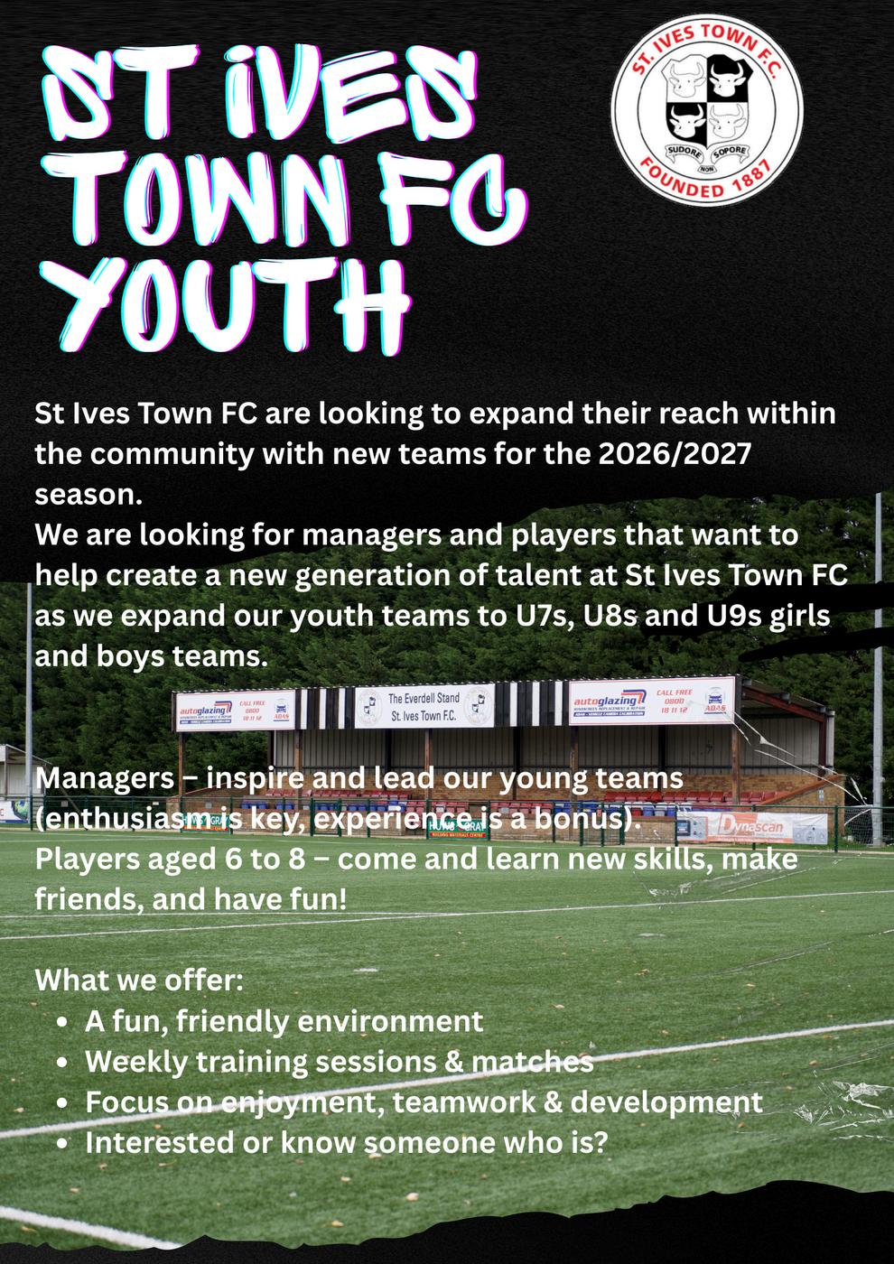 TheyouthsectionatStIvesTownFCcontinuestobeoneoftheclub’s proudestachievements.Everyweek,youngplayersfromacrossthe communitypullontheblackandwhiteshirt,takingtheirfirststepsinto thegameinanenvironmentbuiltonencouragement,enjoymentand opportunity.Whetherit’stheminislearningthebasicsortheolderage groupscompetingacrosstheregion,theyouthsetupisfullofenergy, enthusiasmandagenuineloveforfootball.