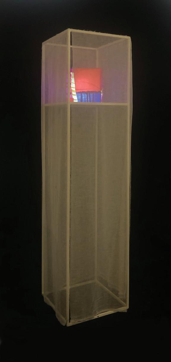 Ci sei? Mi vedi?, 2019 tubolare di ferro, carta velina, plexiglas, garza, luce a led 160x40x40 cm