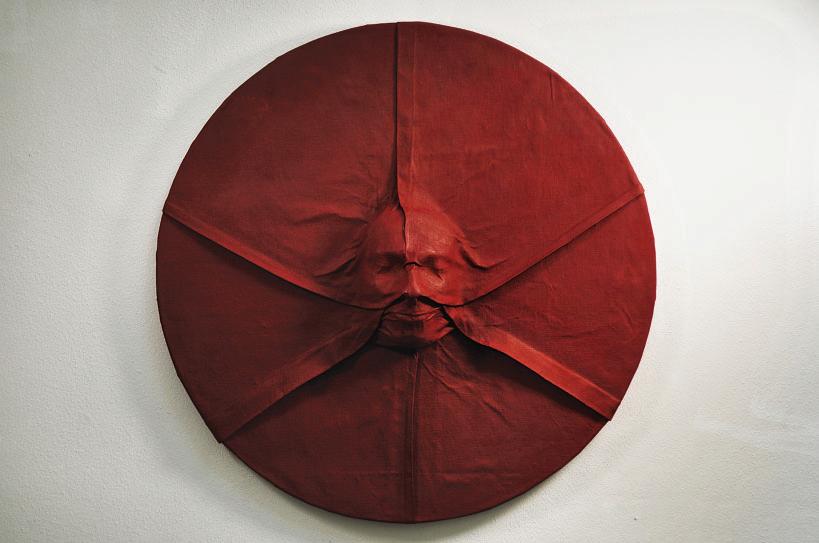 Ivan Bossoni, Personificazione del Sole Alchemico, 2017 estroflessione figurativa ad olio rosso di cadmio porpora, 70x70 cm (opera in mostra).