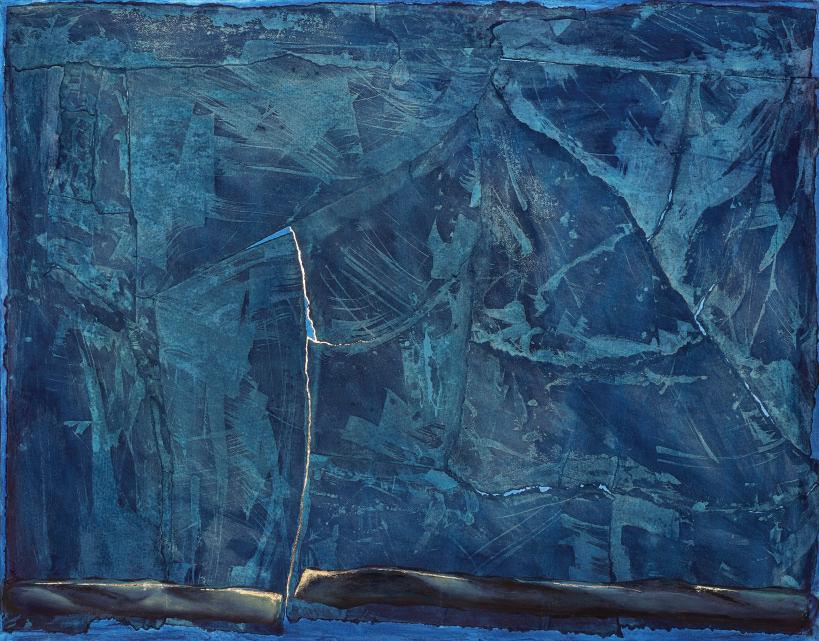 Spazio costruito nel blu, 2017/2022 ferro con disegno acidato a morsura, ferro verniciato alla polvere, plexiglass, acetato blu, 100x85x120h cm