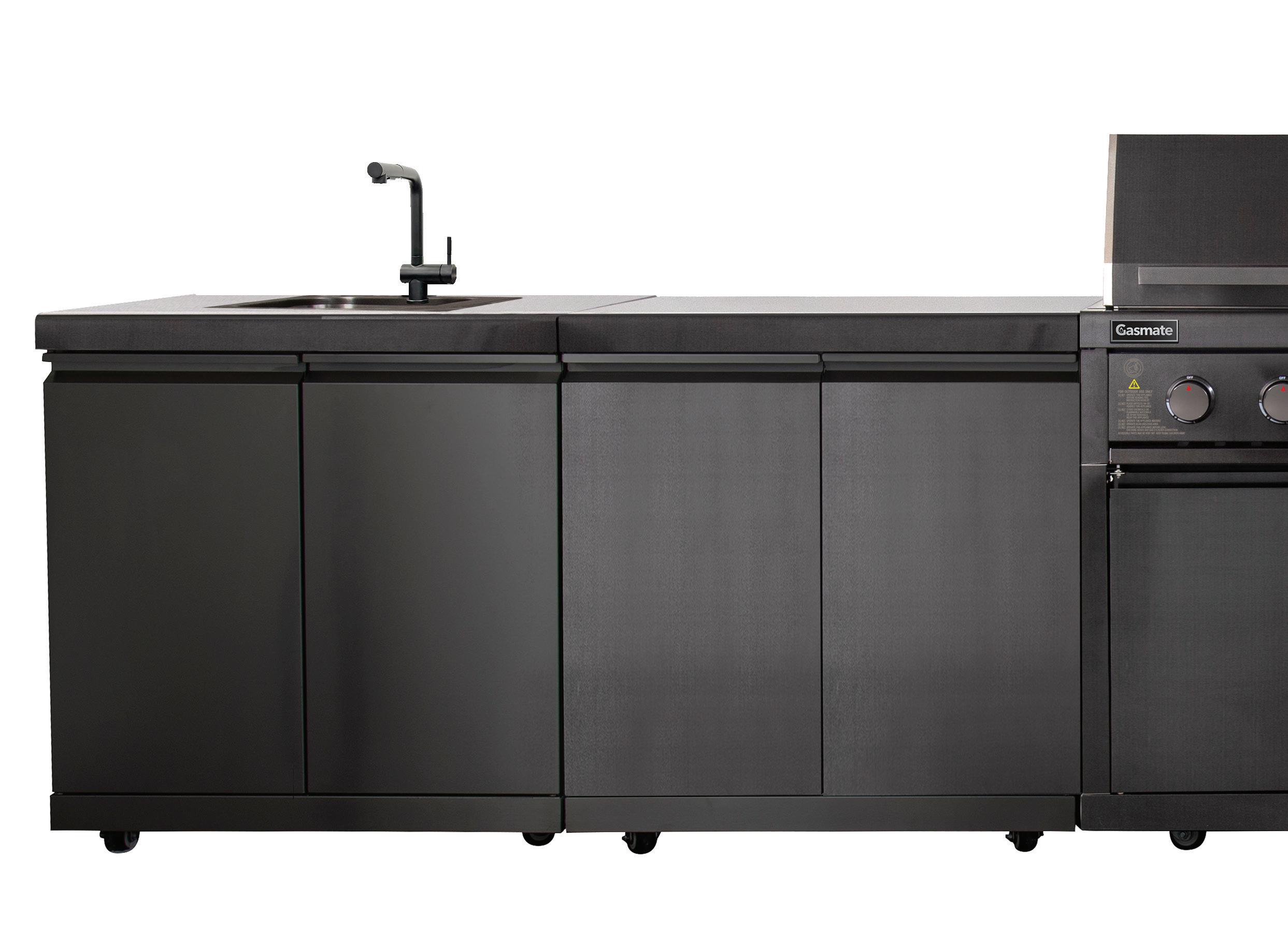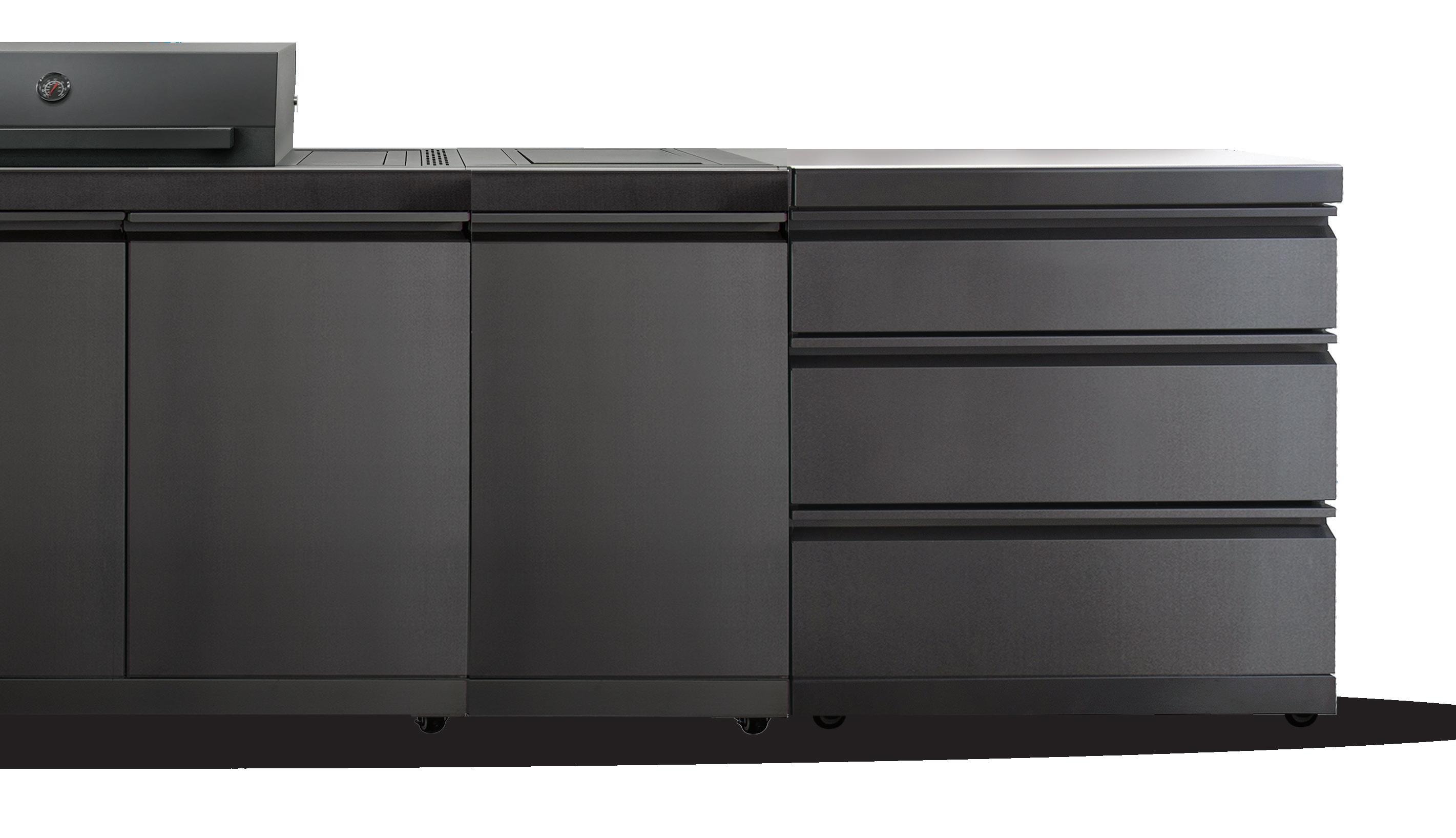 • NOVA MK2 3 Drawer Module features #304 grade Graphite stainless steel fascia, drawers & kick plate with new sintered stone and black powder coated cabinet