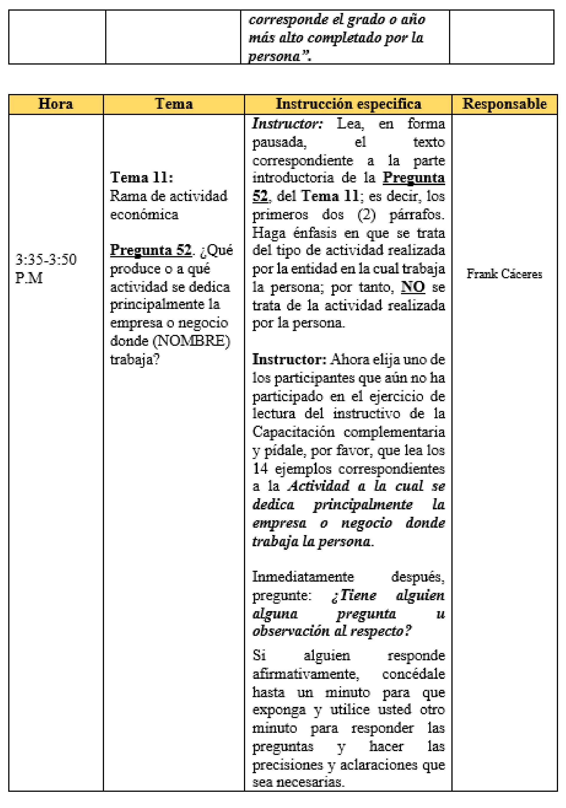 7. Tener los Entrevistadores ubicados de forma cercana entre ellos, permite al Supervisor y al Encargado de Supervisores observarles más entrevistas, incluso al Encargado de Distrito, que también debe involucrase de lleno en esta tarea de seguimiento, en esos primeros días le facilita una mejor observación. Para levar a cabo este tipo de observación, se recomienda que el observador anote en forma paralela algunas de las respuestas dadas por el informante a ciertas preguntas, o, colocarse detrás del Entrevistador para ver cómo va completando el cuestionario, de manera que, cualquier discrepancia entre ambas anotaciones, socializarla al final con el Entrevistador, garantizando que se haga el llenado correcto.