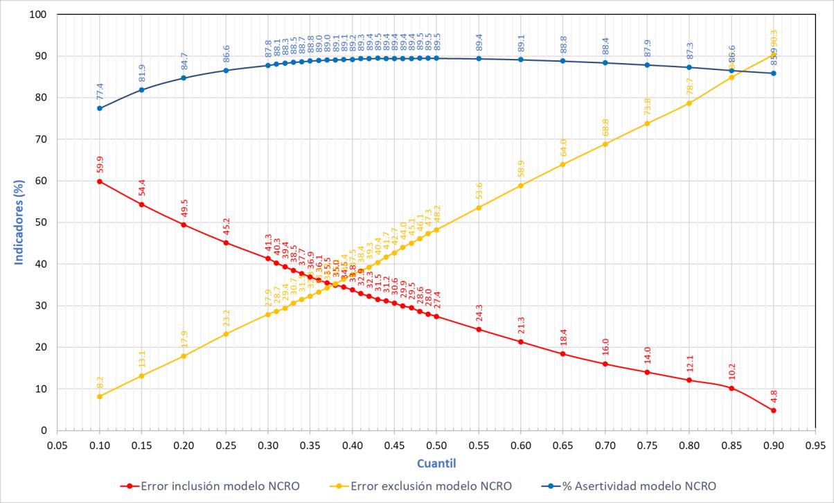 El modelo cuantílico nominal para el ingreso pc oficial con variables ocupacionales (RCNO), fue ajustado para el cuantil 37. La decisión del cuantil 37 se tomó considerando que este modelo ha sido ajustado con el propósito principal de calcular tasas de pobreza monetaria para los mapas de pobreza monetaria; y en este cuantil fue donde la tasa de pobreza monetaria general calculada con el ingreso ajustado por el modelo coincidió casi exactamente con la tasa general registrada (oficial). El modelo final quedó estructurado con un total de 50 variables estadísticamente significativas, incluyendo 8 variables de carácter laboral.