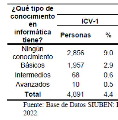 Niveldeconocimientoeninformática:Focalizadoenlapoblación de 7 a 65 años. Se registran 31,856 (28.5%) personas con ningún conocimiento en informática, 66,996 (59.9%) con conocimiento básico, 10,819 (9.7%) con conocimiento intermedio y 2,116 (1.9%) con conocimiento avanzado. Se destaca una correlación entre las categorías de ICV y el conocimiento en informática. Los conocimientos intermedio y avanzado son más comunes en personas categorizadas ICV-3 o ICV-4. En términos de sexo, los